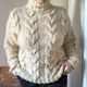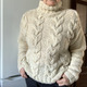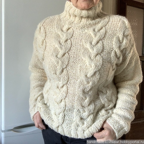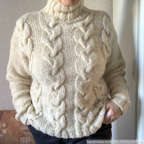 Свитер крупной вязки Объемные косы связан из шерстяной пряжи типа деревенской молочного цвета с добавлением мохера. Модный высокий ворот, косы выполнены по переду и спинке. Классика, не выходящая из моды. Свитер молочного цвета показан на размере 48-50. Можно рассматривать этот свитер на размер 44-46, будет смотреться более свободным (оверсайз).