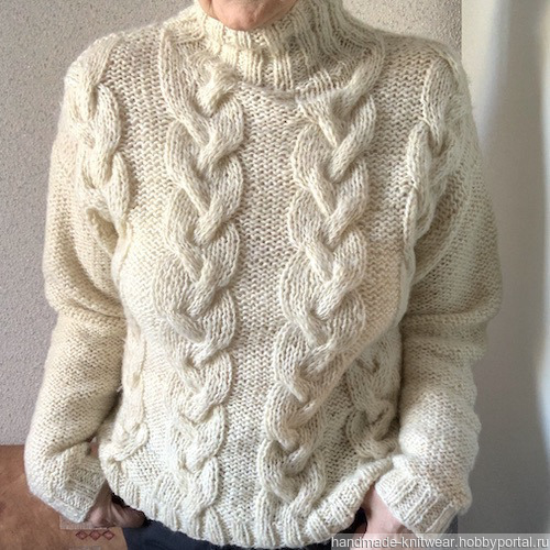 свитер женский, свитер вязаный, свитер спицами, свитер теплый, белый свитер, свитер с косами