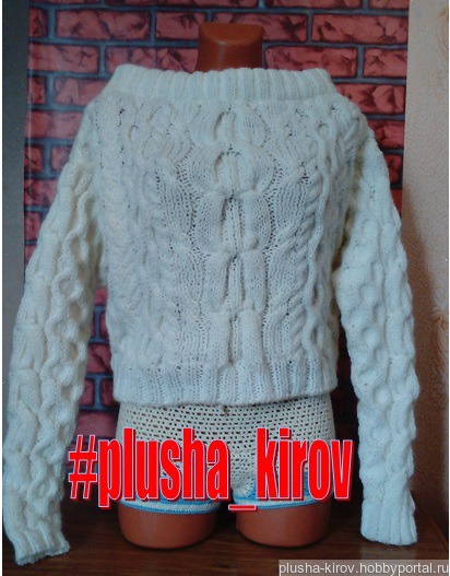 Мягкий, тёплый, имеет 3 варианта ношения (обычный свитер, спущенный на одно или оба плеча). Связан по мотивам известной модели свитера сестёр Рубан.