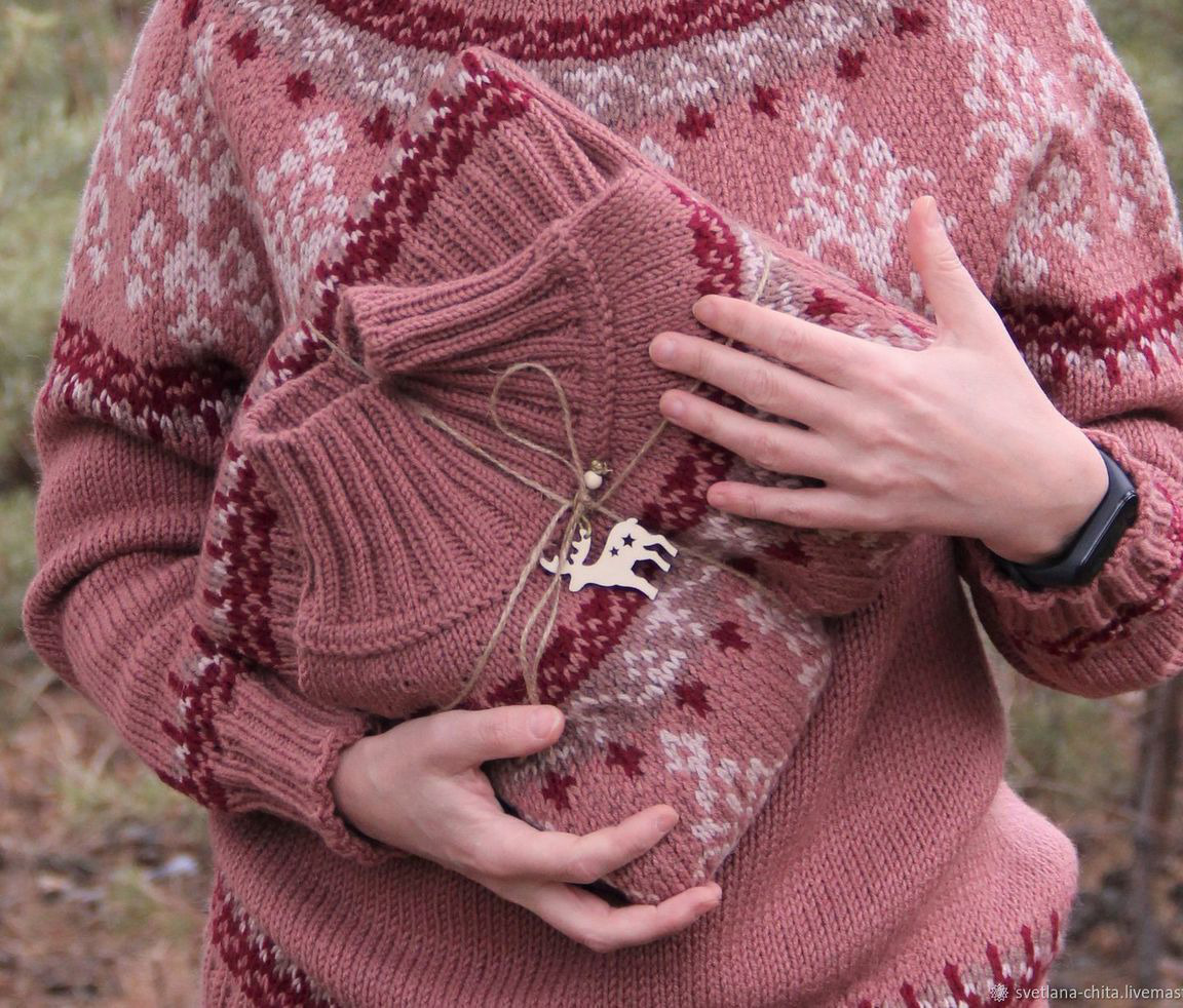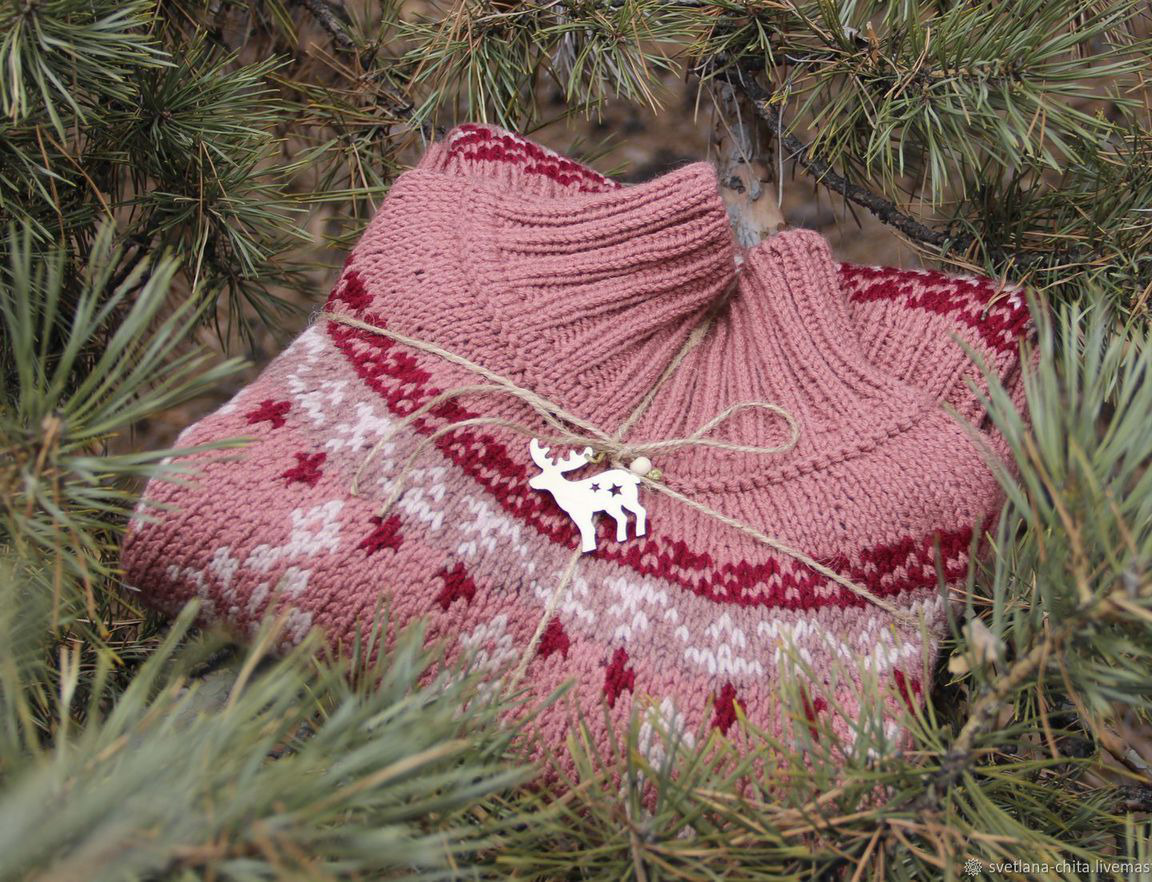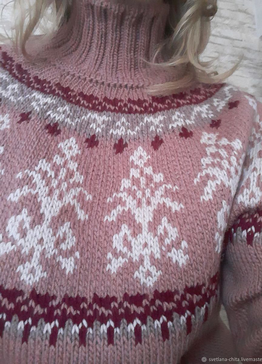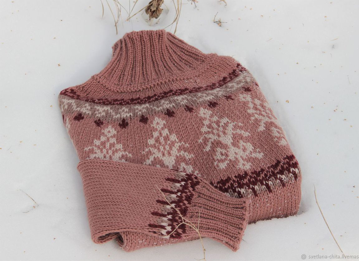 Свитер связан спицами в технике бесшовного вязания. Круглая кокетка, низ изделия и рукавов украшены жаккардовым узором. Дизайн авторский. Возможно исполнение в разных размерах и цветах.