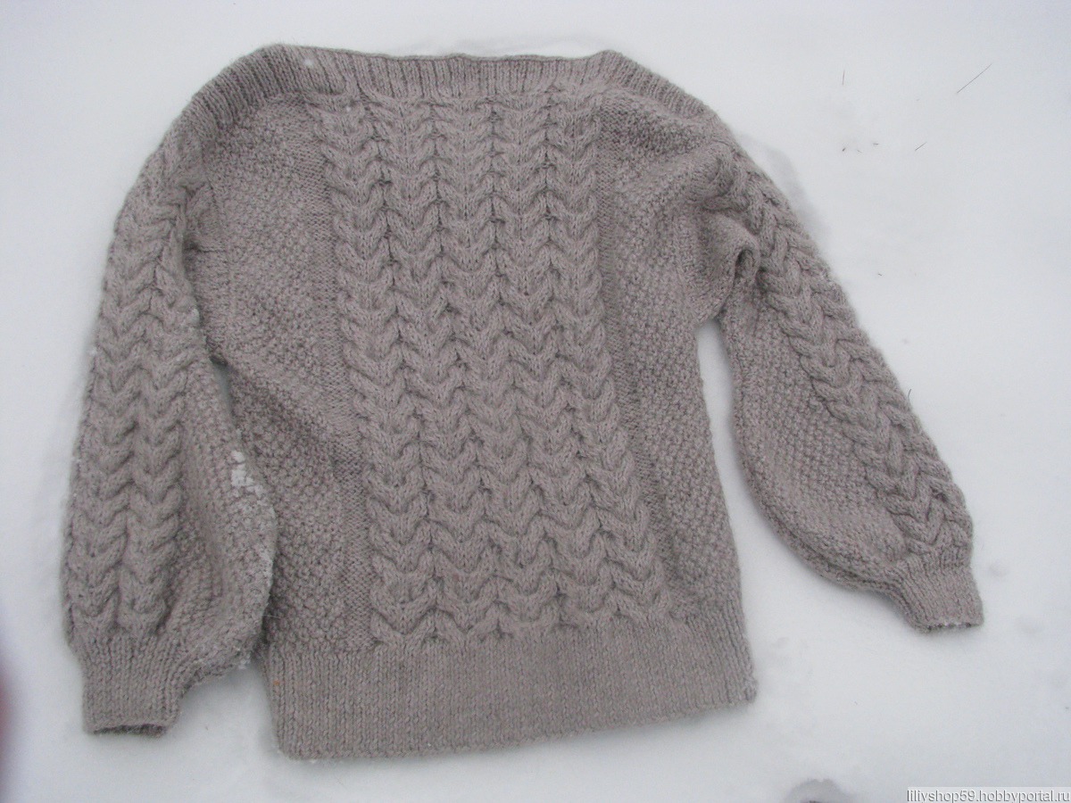 Свитер женский. Связан из верблюжьей шерсти 50%. Очень модный фасон. Горловина-карэ-голые плечи, рукав фонарик. Очень теплый.