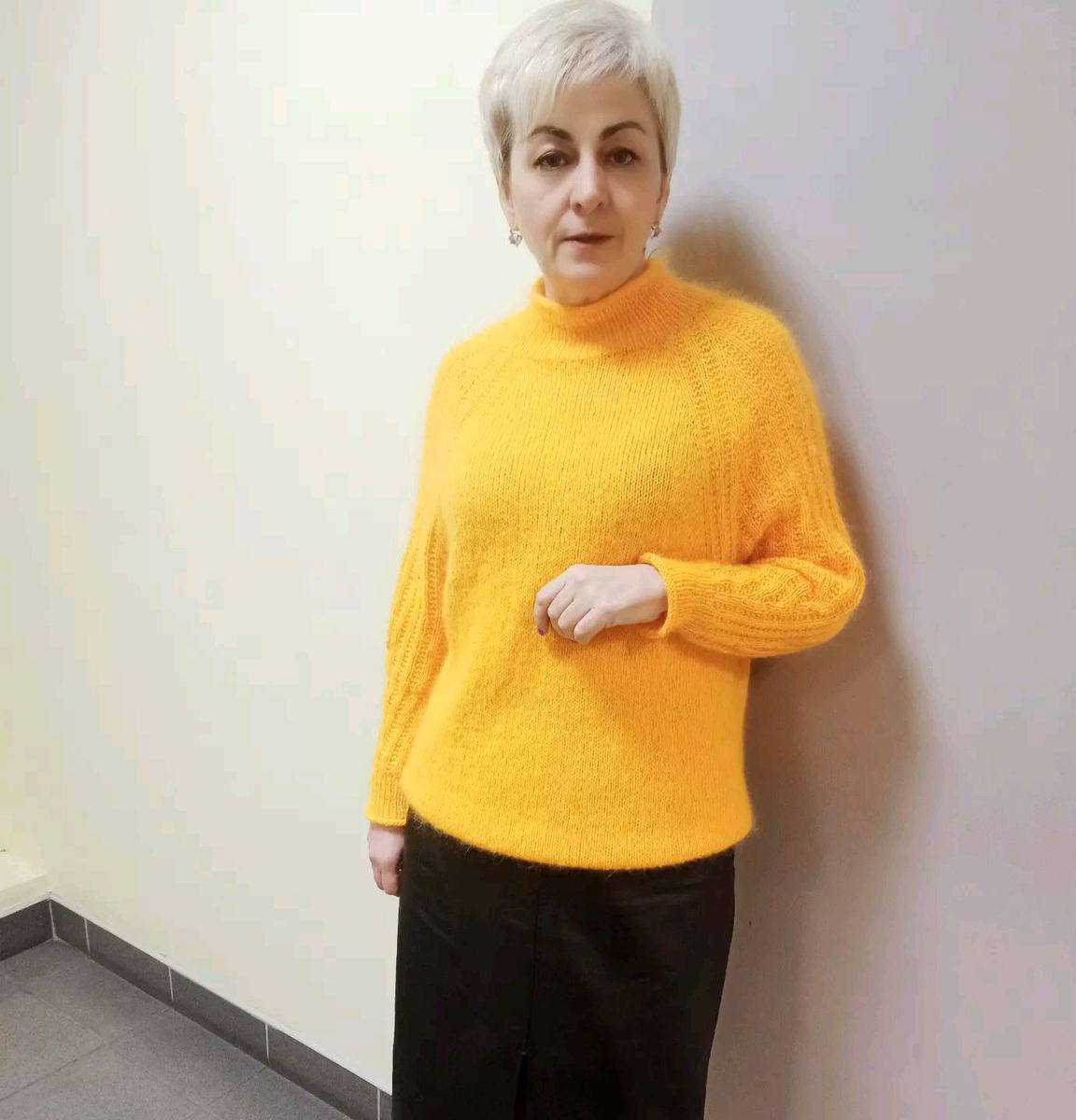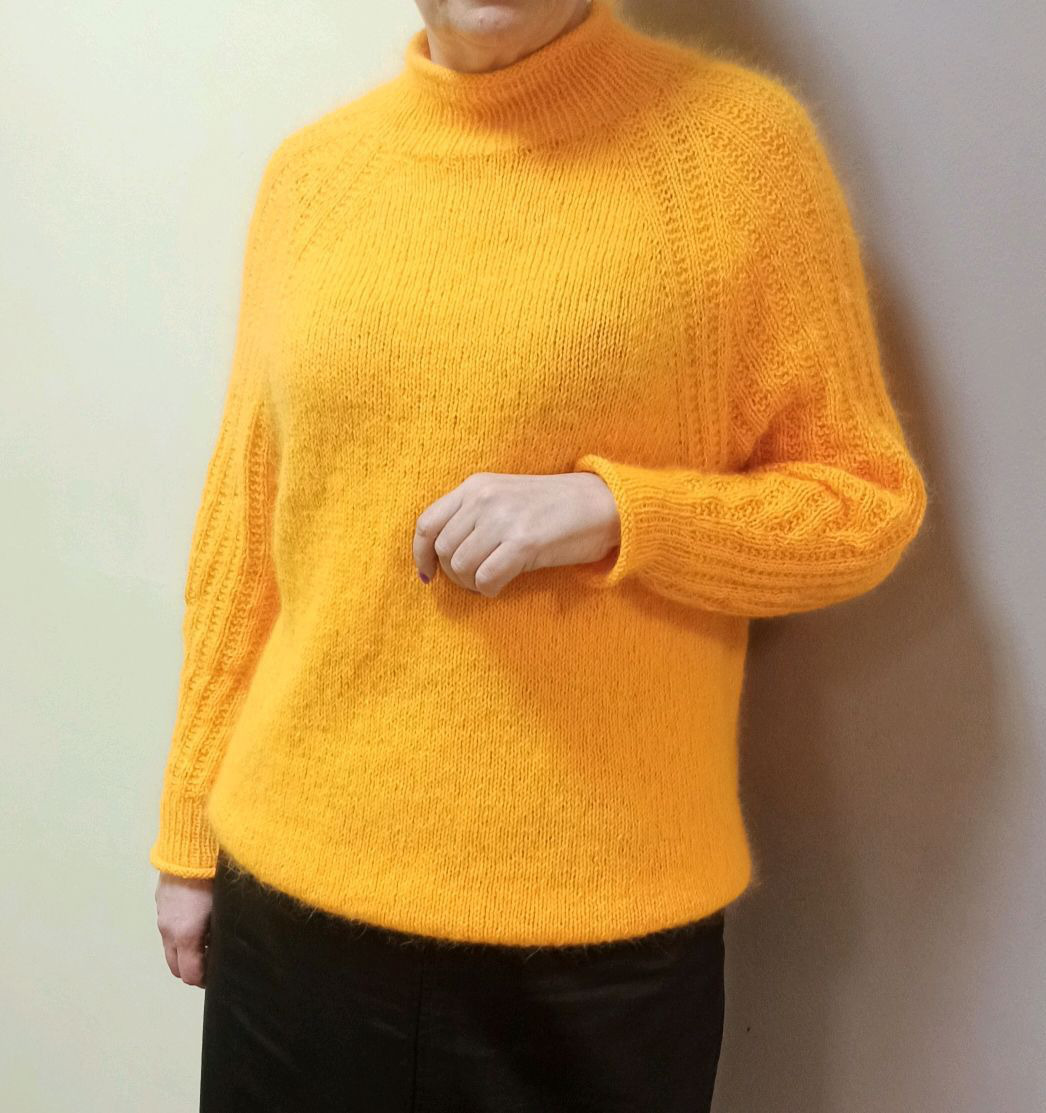 Свитер связан с удлиненной линией реглана.Свободного облегания.Очень удобный и подходит на любую фигуру.