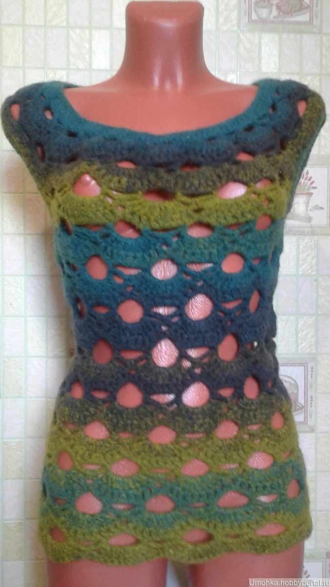 Вязанная крючком туника "Весна" изготовлена из прибалтийской шерсти "Дундага". Крупная ажурная вязка, плавные цветовые переходы. Туника полностью без швов, начало вязания - горловина, по кругу. Рукав слегка приспущен. Хороша в комплекте с рубахой и водолазками. Несмотря на то, что туника связана достаточно крупным ажуром, очень теплая. Красиво смотрится с широким ремнем. Размер:объем груди, талии - 78 см., объем по низу - 82 см., длина изделия - 59 см., объем горловины - 52 см., плечи - 11 см., пройма 15 см.,