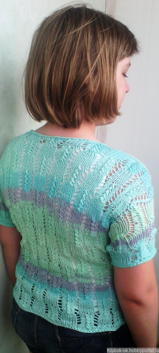 Вязанная спицами летняя кофта "Варенька" выполнена на размер 38-40 на заказ! Ниточки 50% хлопок 50 % акрил. Передние полочки кофточки выполнены с запахом. Буду рада повторить по вашим меркам!