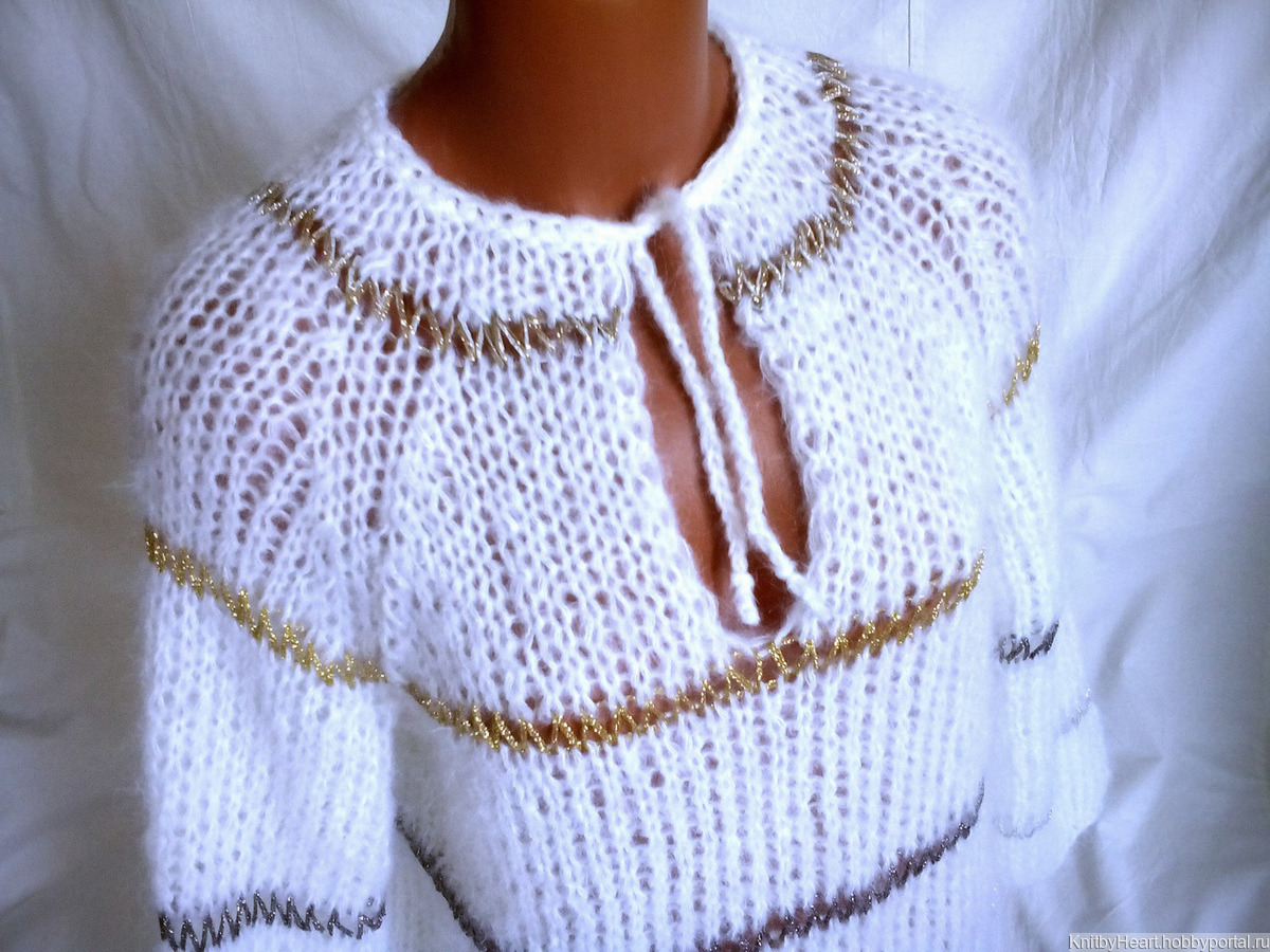 Стильный вязаный свитер из кид-мохера теплый и нежный. Спереди глубокий вырез на завязках.