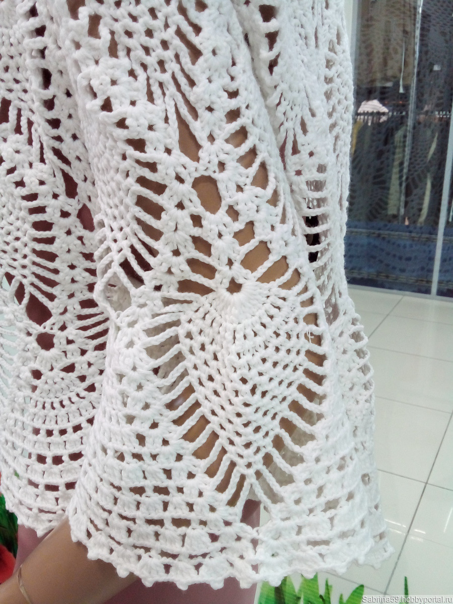Потрясающей красоты укороченный жакет из хлопка. Изделие цельно вязаное ,без швов. А рисунок-ананасы разных размеров смотрится просто восхитительно! По низу изделия и рукавам выполнен веерный рисунок, который дает небольшое расширение. Это изделие никого не оставит равнодушным.