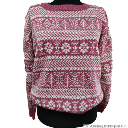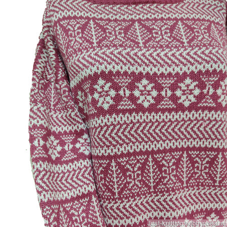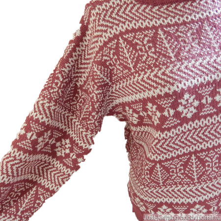 Джемпер жаккардовый женский вязаный. Связан на вязальной машине. Два цвета - брусничный и белый. Состав пряжи- шерсть импортный меринос 50% акрил 50%. Размер 46-48. ширина - 51см, длина - 56см