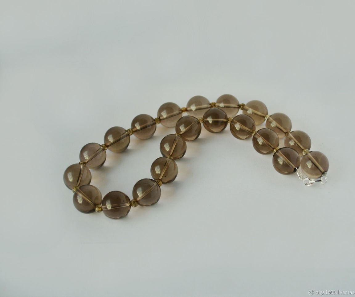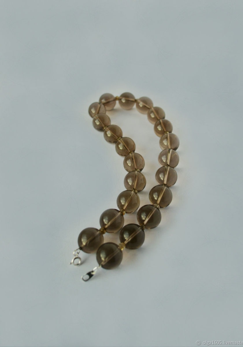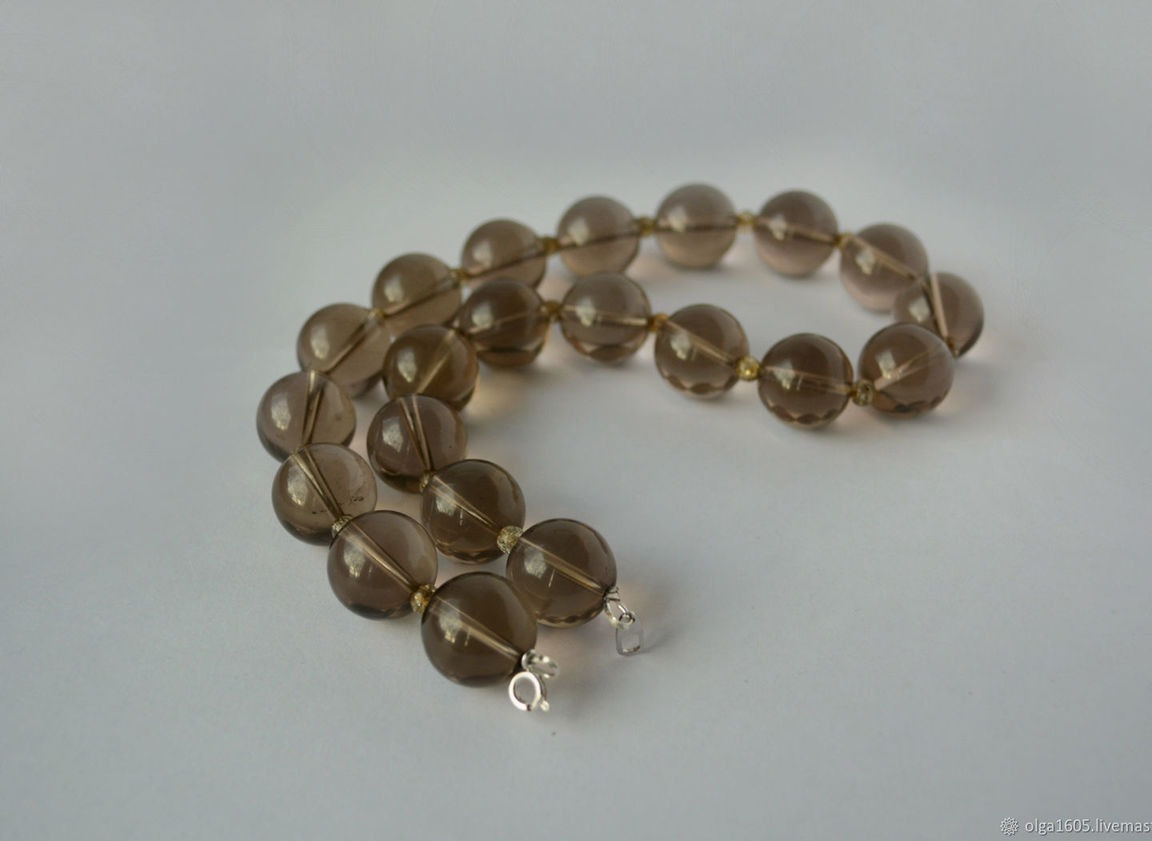 Бусы из крупных бусин натурального раухтопаза (форма - гладкий шар диаметром 16 мм), между которыми вставлены гладкие бусины ледяного кварца кракле диаметром 4 мм