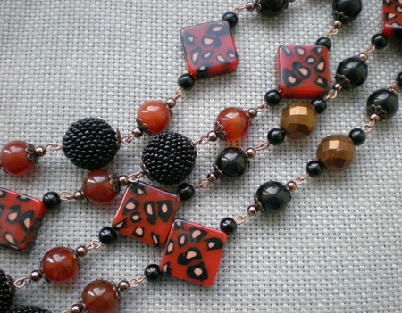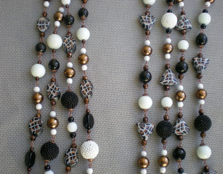 Возможно также изготовление подобных бус из остатков материалов в сине-черно-белых тонах, в черно-белых тонах, в зеленых тонах.