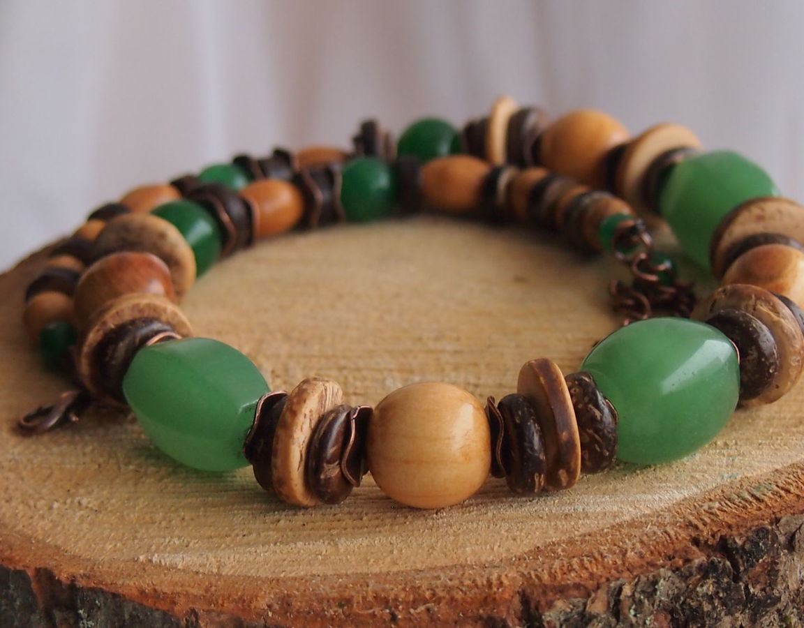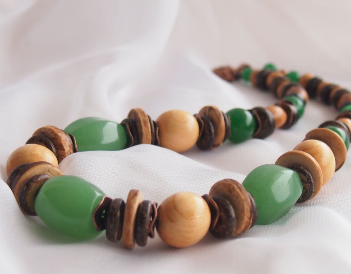 У меня под рукой оказалась слива, крупный нефрит, хризопраз, кокос - разных размеров, и немножко медной фурнитуры )))