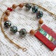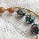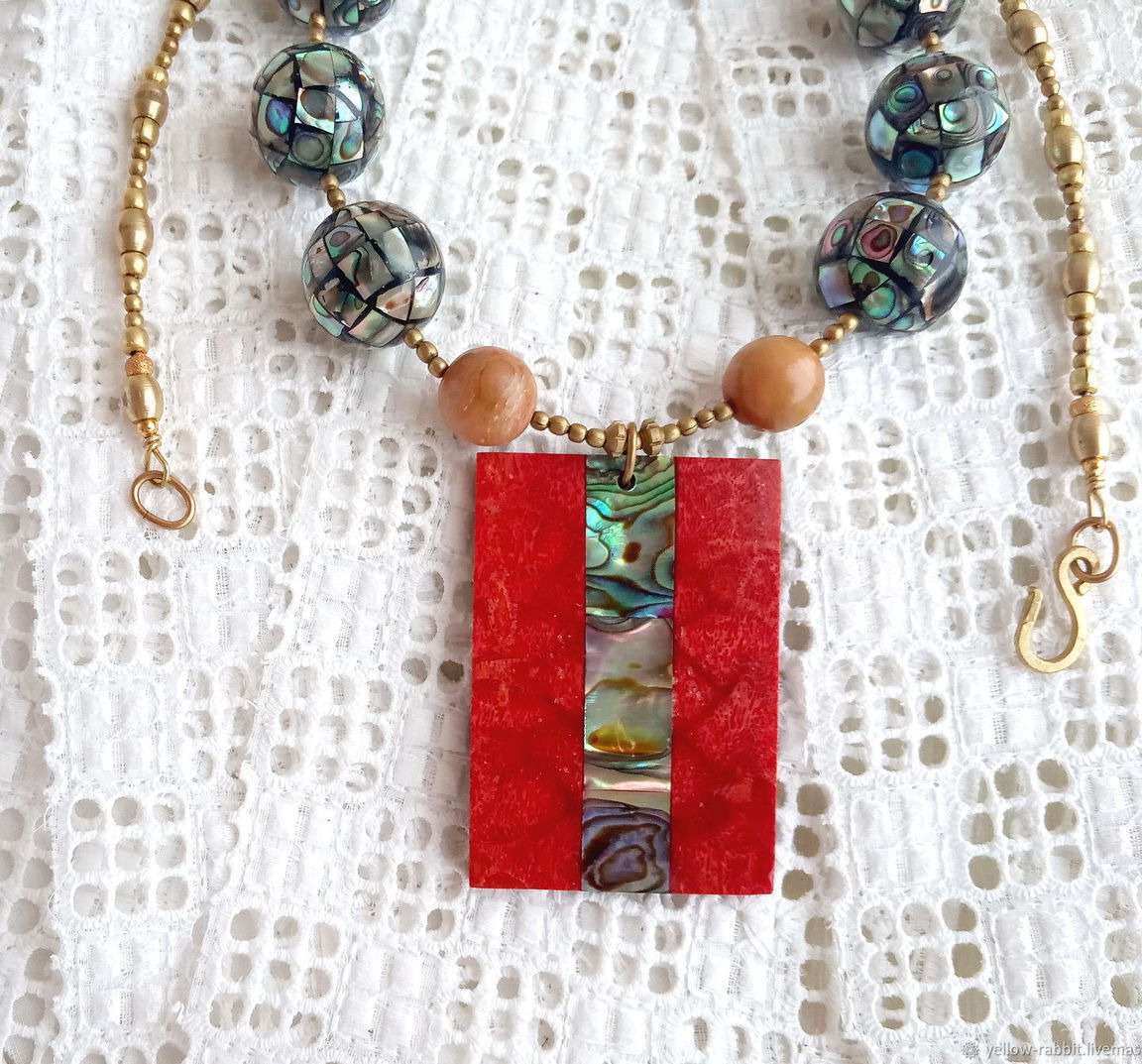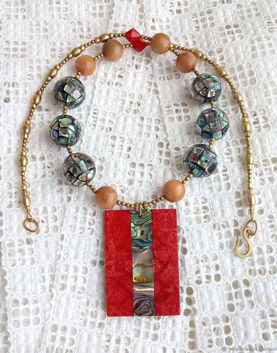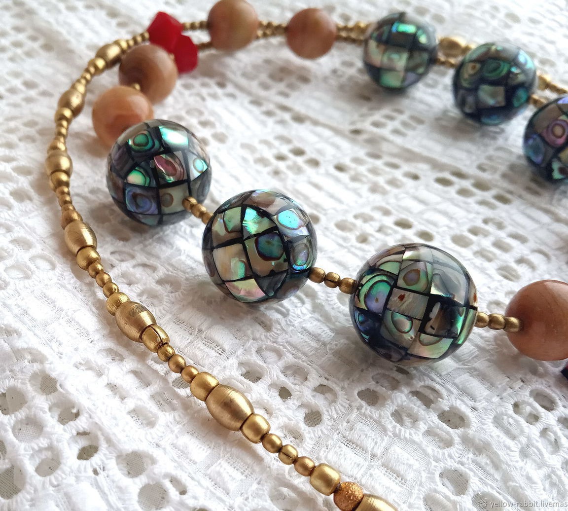 В бусах пара биконусов Сваровски красного цвета, непальская латунь, индонезийские бусины из морского ежа, мозаичные бусины из перламутра пауа и прозрачной синтетической смолы.