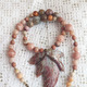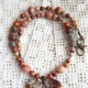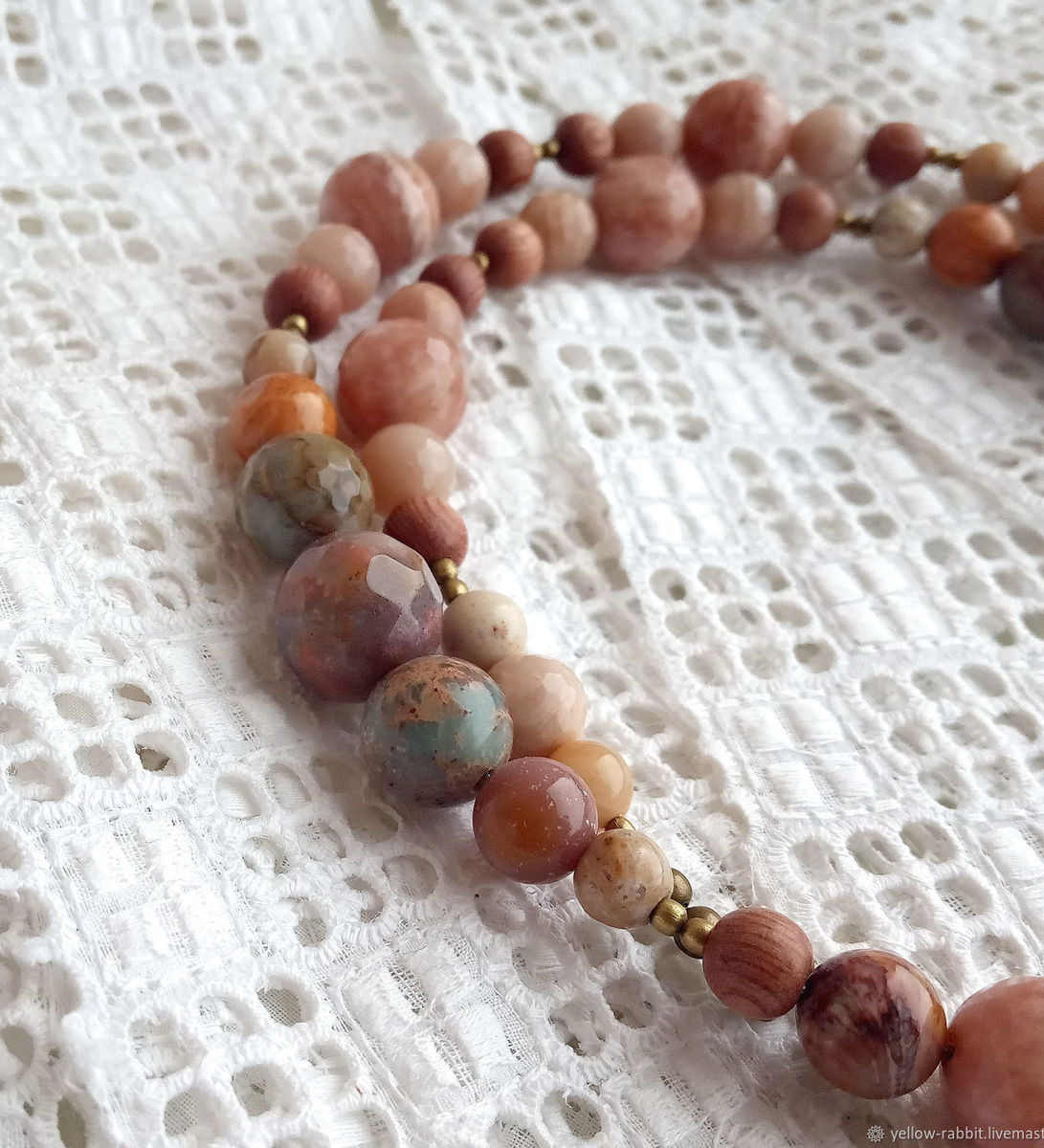 В бусах дивных, сложносочиненных оттенков индийский агат, окаменелый коралл, пара бусин варисцита, пара бусин мукаита, солнечный камень с мелкой огранкой, бусины из розового дерева и непальской латуни.