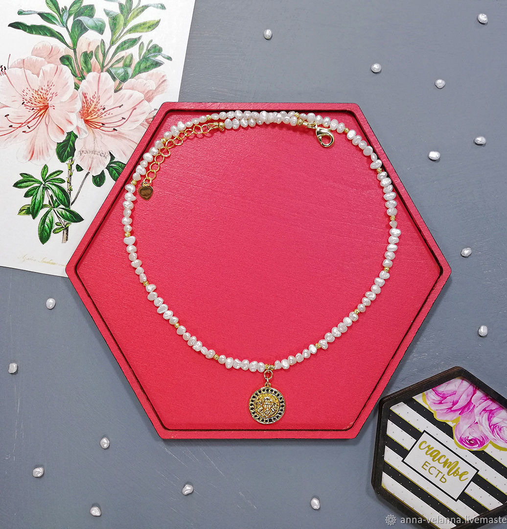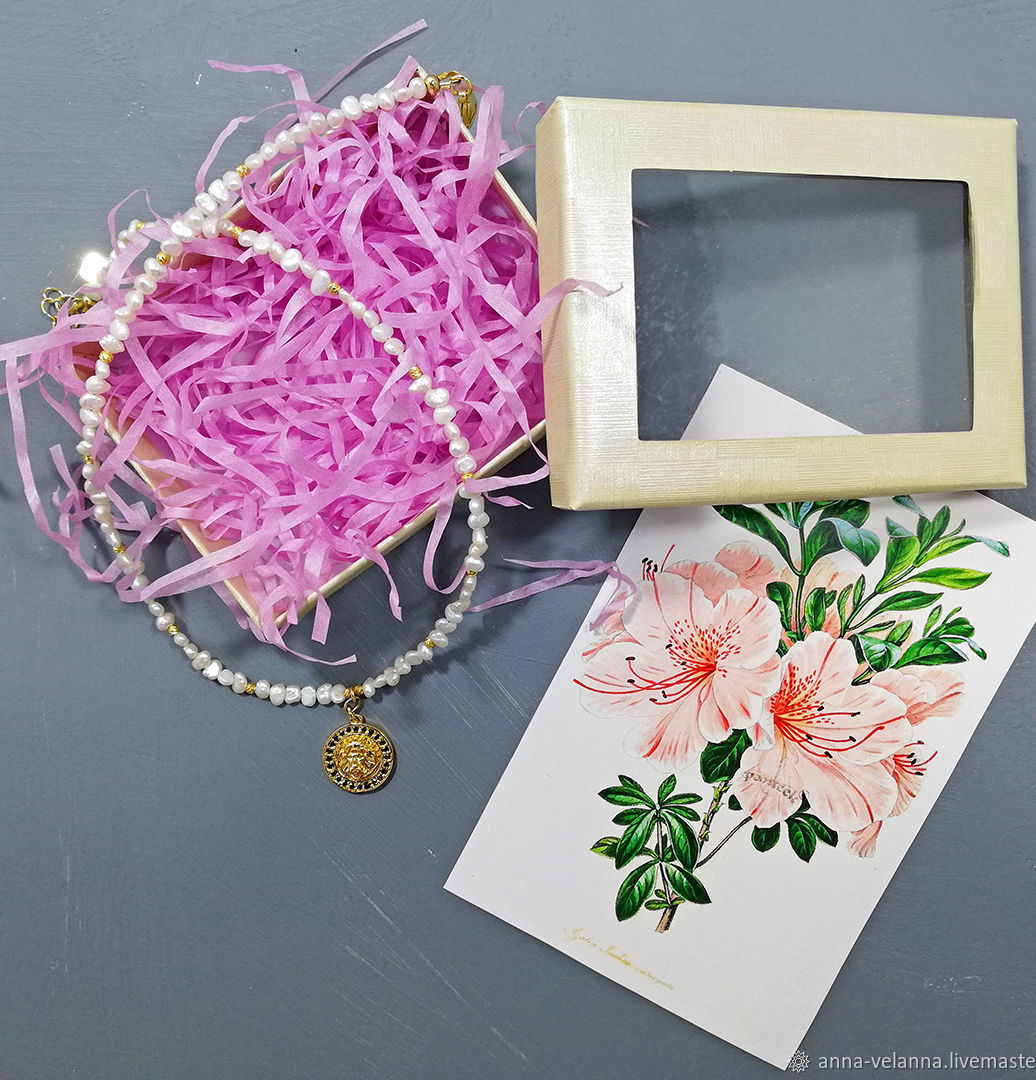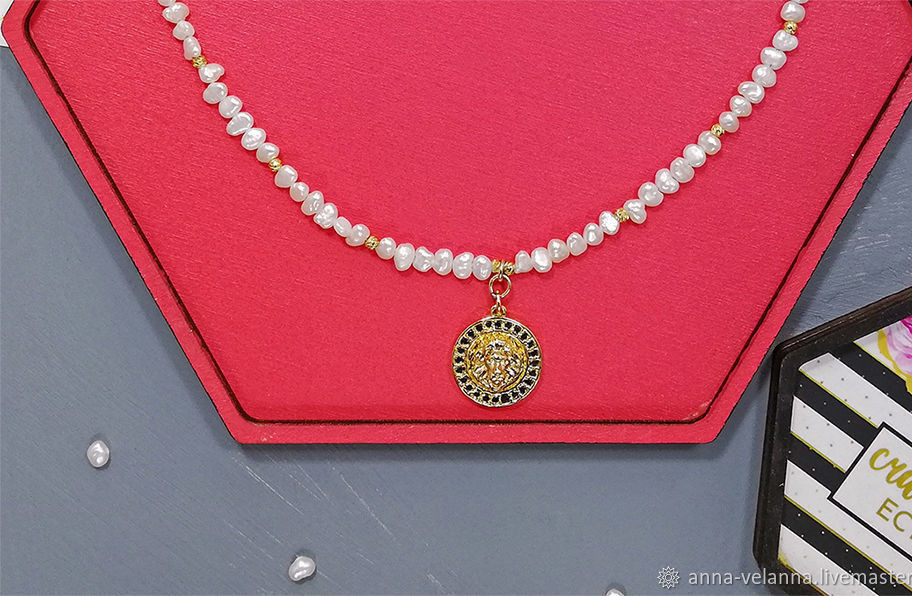 Изящный чокер-колье «Нежность жемчуга» изготовлен из мелкого речного жемчуга с подвеской Лев (в стиле Versace) с фианитами. В изделии использована качественная фурнитура с позолотой.