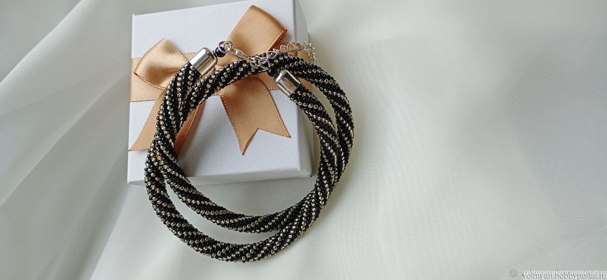 Красивый плотный жгут из трех цветов бисера (черный, металлик и светлое золото)