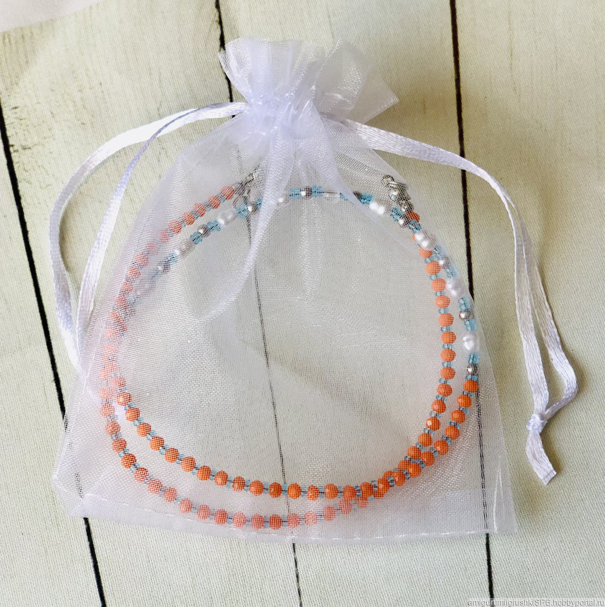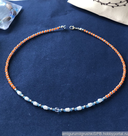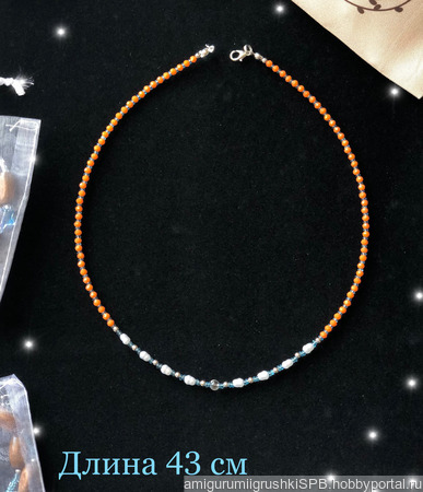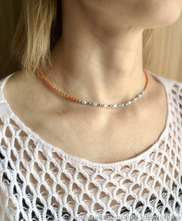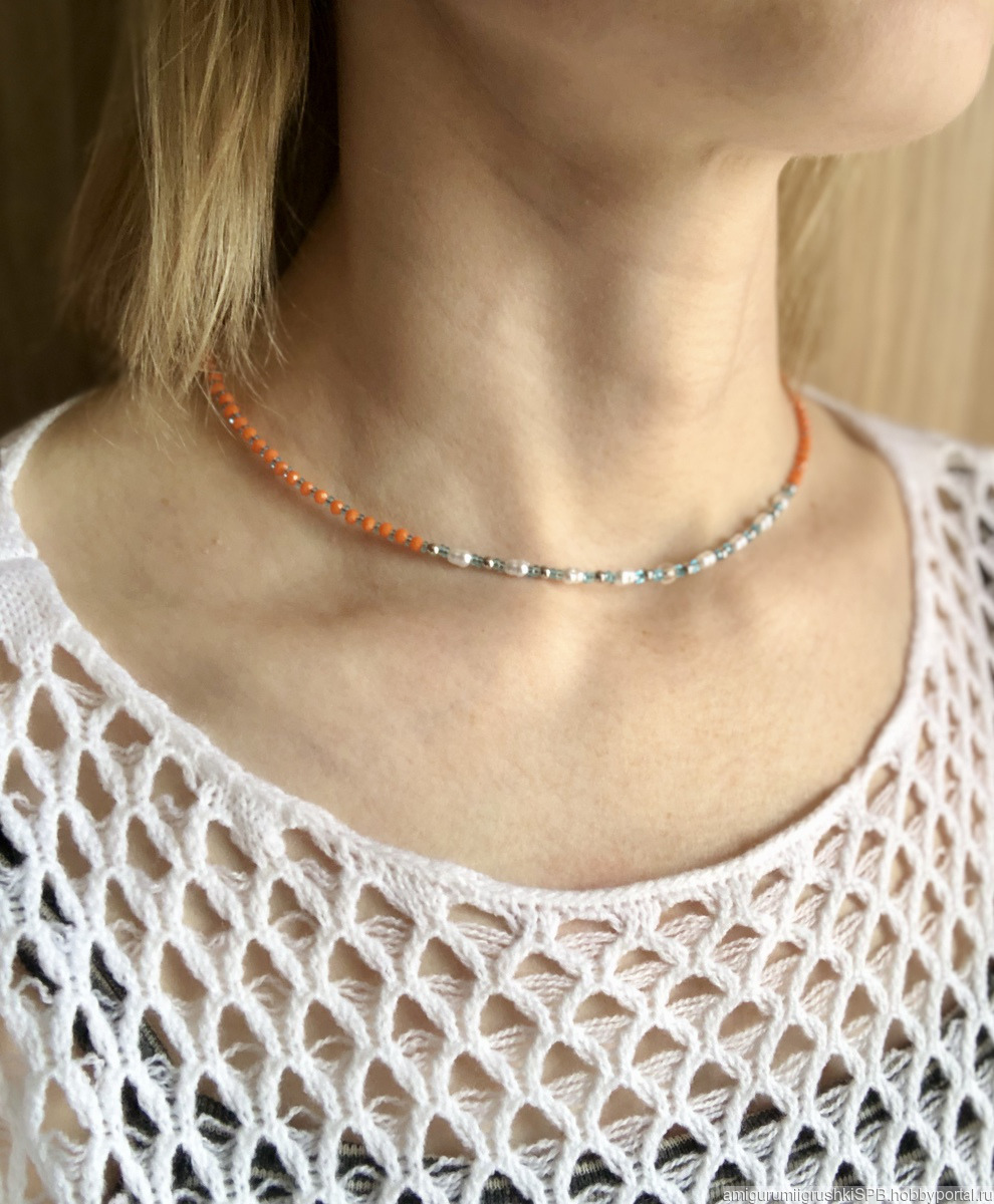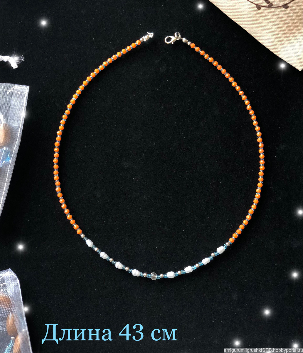 Оранжевый чокер из шпинели и бисера с бусинами под жемчуг. Собран на ювелирный тросик.