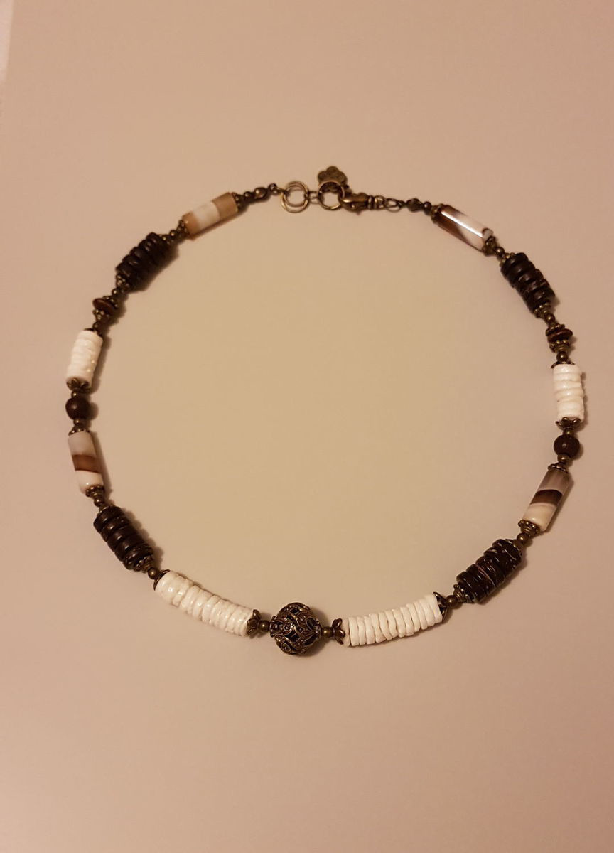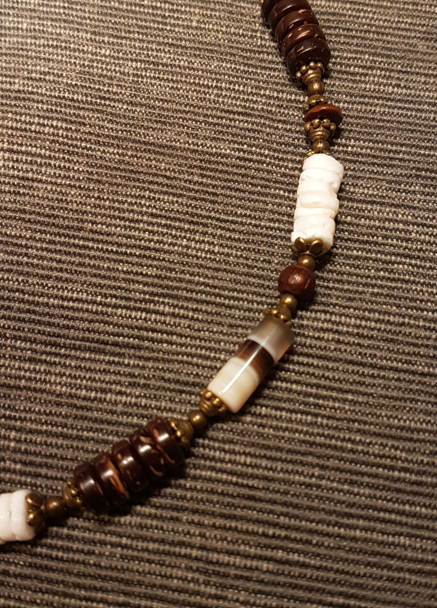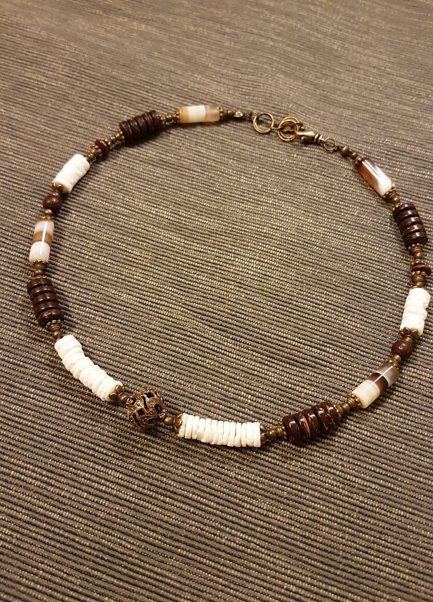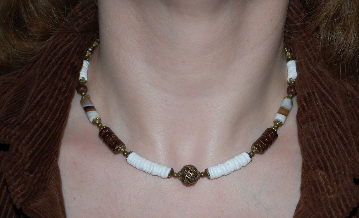 Яркий, необычный чокер с бусинами из белоснежных морских ракушек, бусинами кокоса, деревянными бусинами и очень красивыми бело-коричневыми бусинами агата. Фурнитура - латунь. Центральная бусина изготовлена вручную, на заказ.