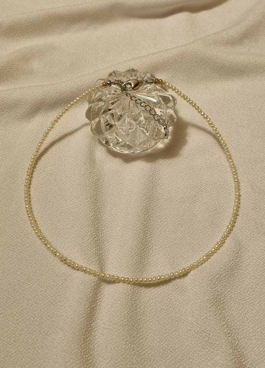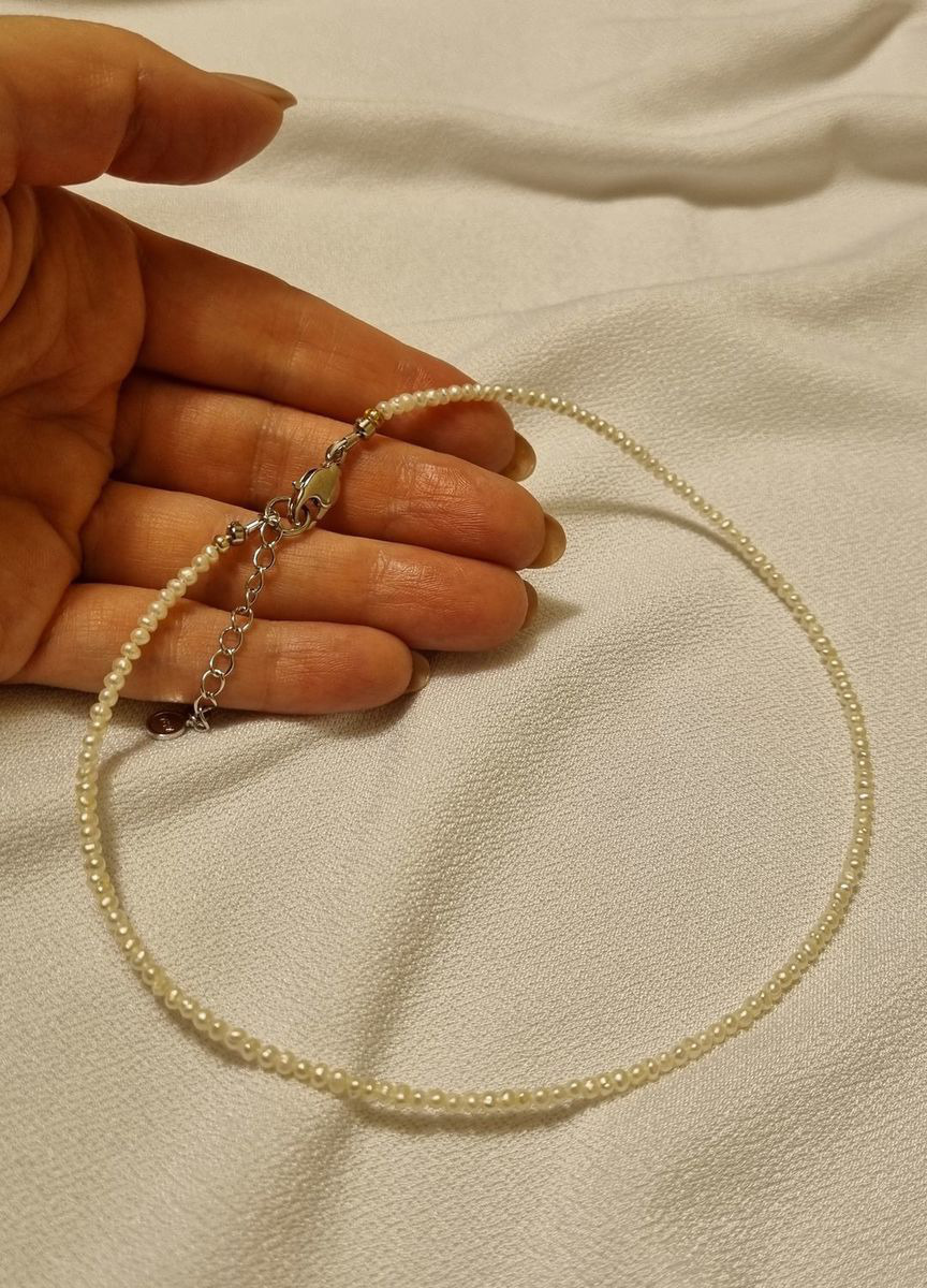 Тонкий изящный чокер из белого речного жемчуга. Размер жемчужин 2-3 мм. Жемчуг натуральный, пресноводный, культивированный. Размер чокера 37 см плюс 5 см удлиннительная цепочка. Фурнитура - латунь с родиевым покрытием.