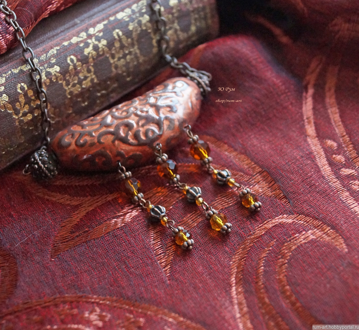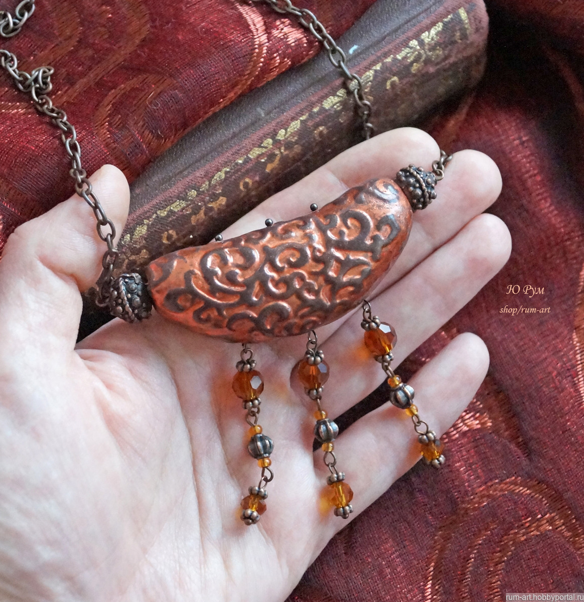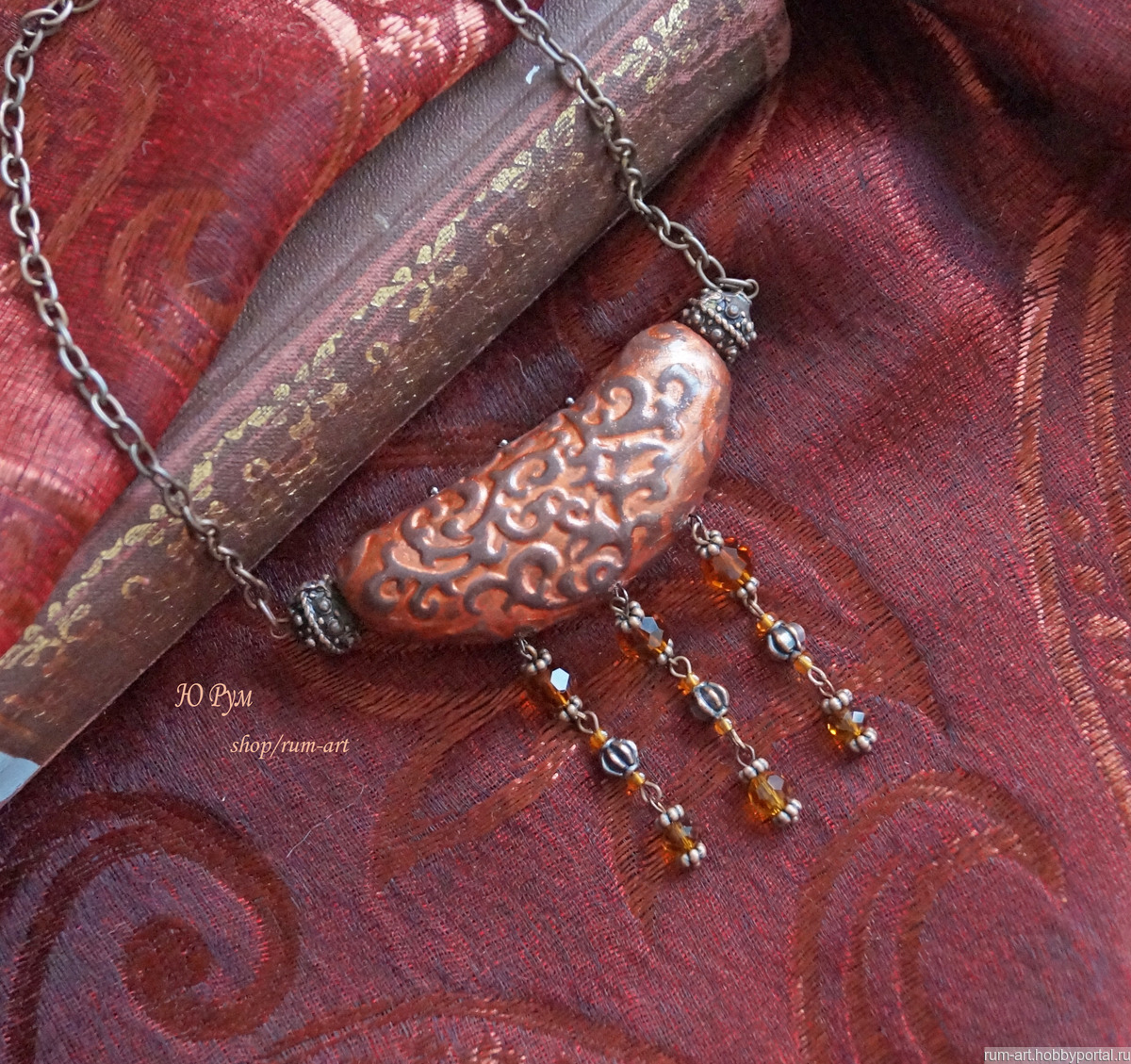 Центральный элемент колье выполнен из запекаемой полимерной глины, внутри полый, рельефный узор затонирован акриловой краской металлик, покрыт лаком на водной основе.