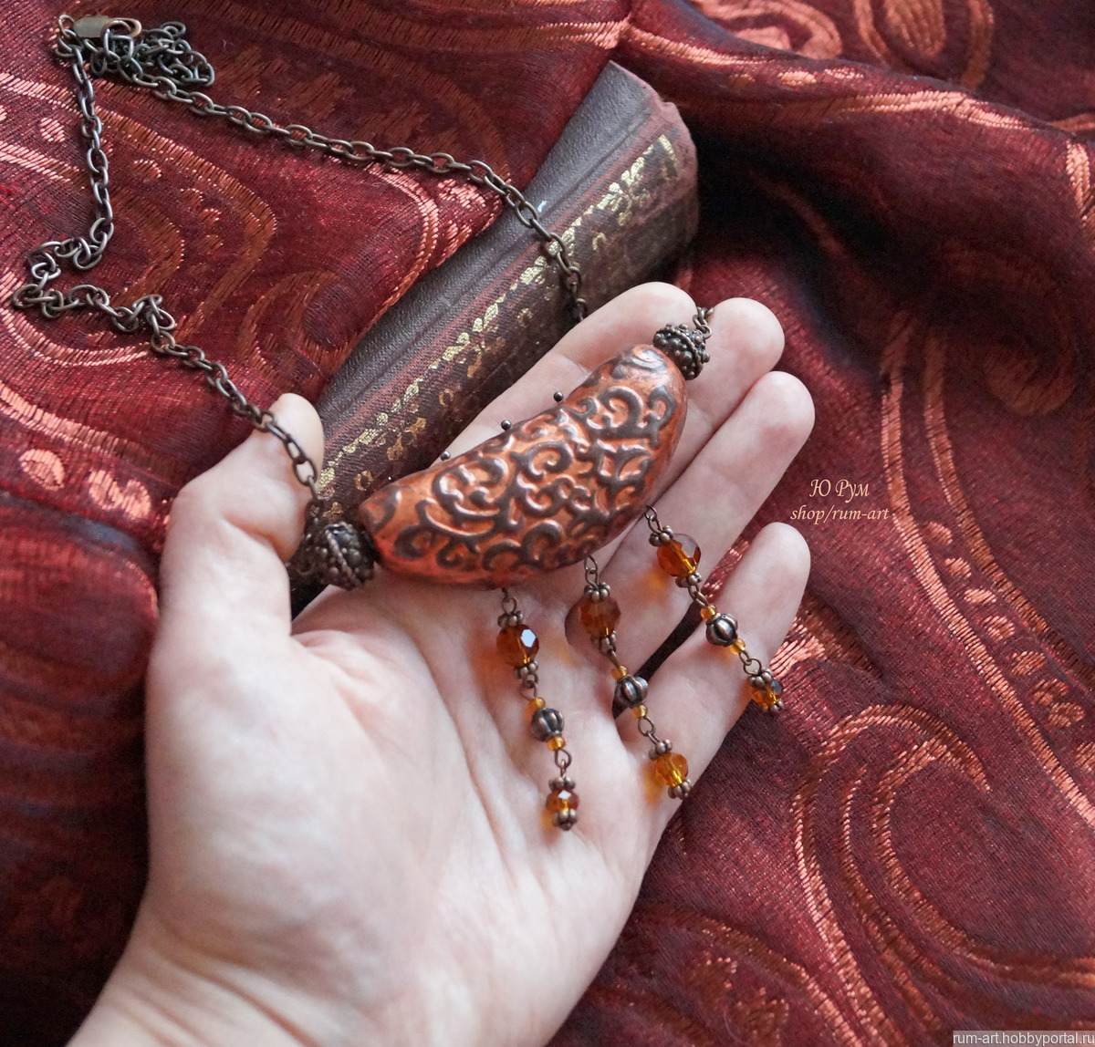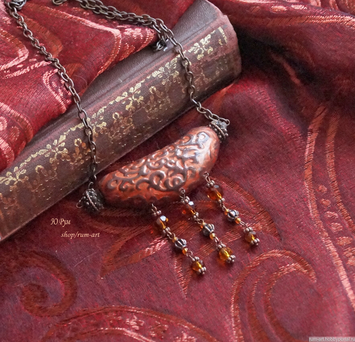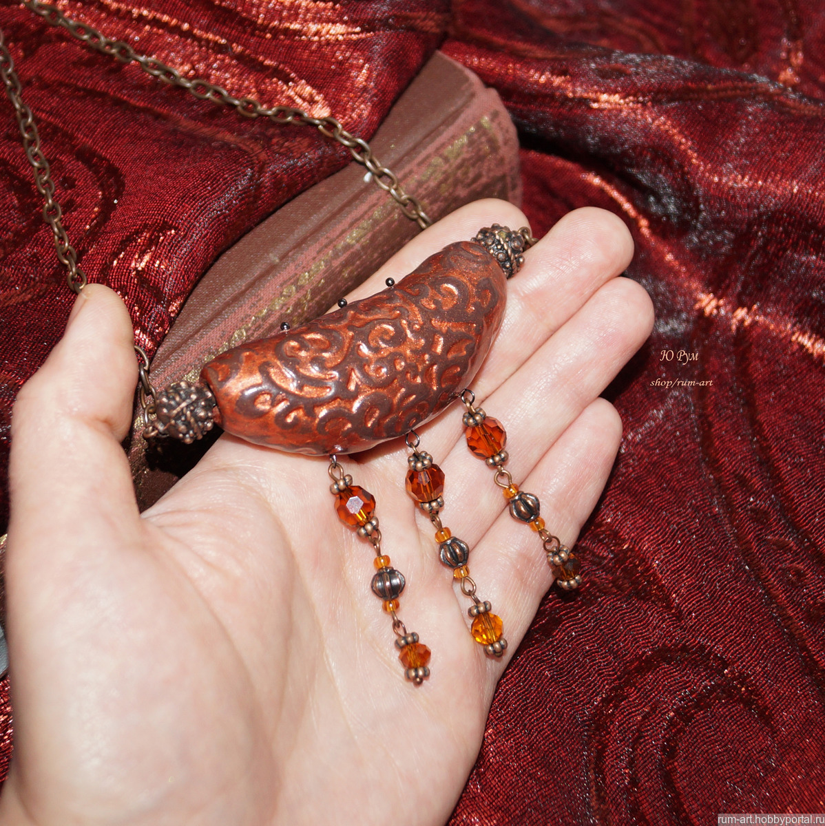 Центральный элемент колье выполнен из запекаемой полимерной глины, внутри полый, рельефный узор затонирован акриловой краской металлик, покрыт лаком на водной основе.