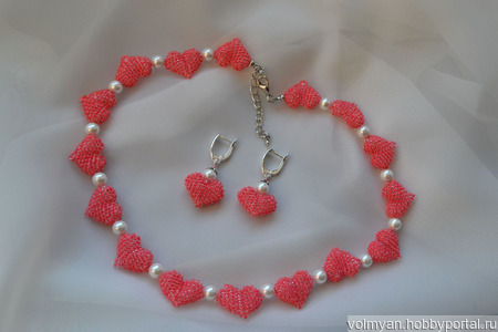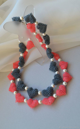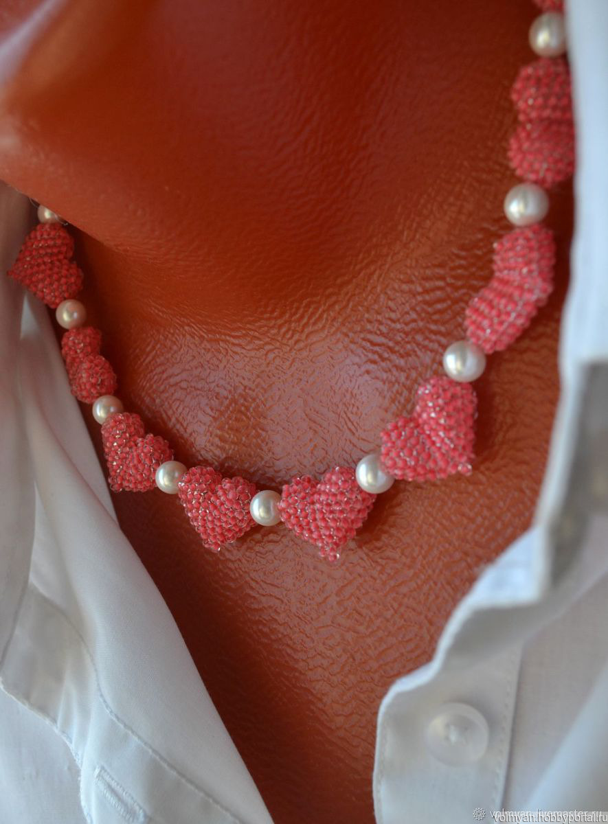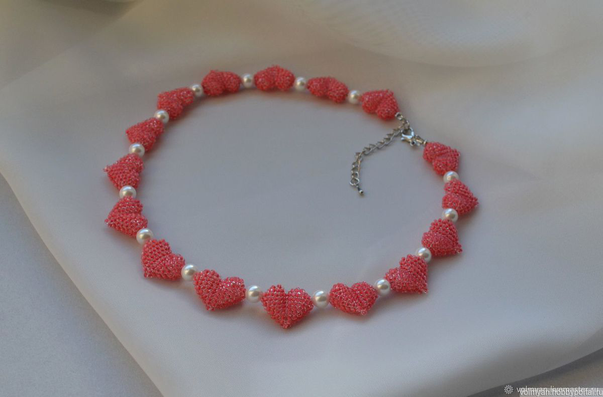 Нежное колье Сердечки выполнено из чешского бисер и дополнено жемчужинами майорка.