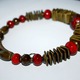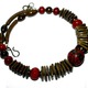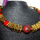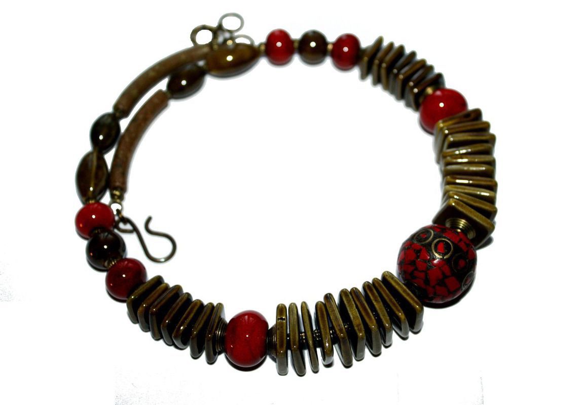 Колье "Сиртаки". Выполнено из греческой керамики ручной работы. По центру колье - тибетская бусина с латунью и инкрустацией кораллом. Размер бусины 23 мм. Дополняет колье латунный замочек-крючок. Колье хорошо держит форму, собрано на проволоку с памятью. Размер колье 44-50 см.