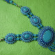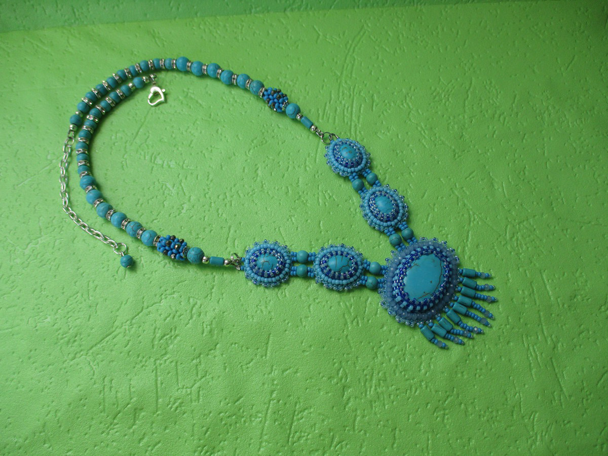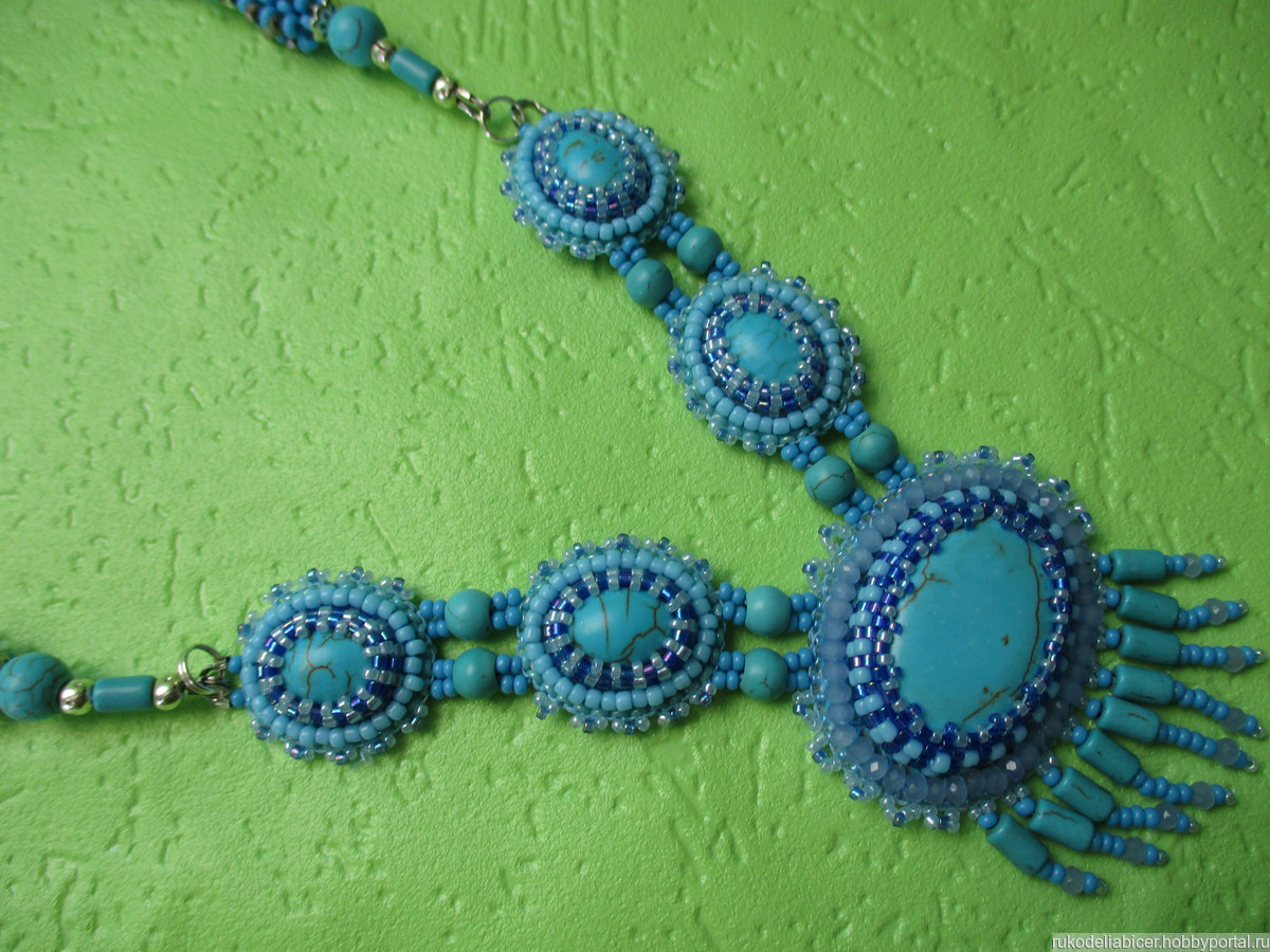кабашоны бирюзы оплетены японским бисером и собраны в колье с помощью бусин. бусины собраны на ювелирный тросик. длина колье с удлиняющей цепочкой 50+7 см.