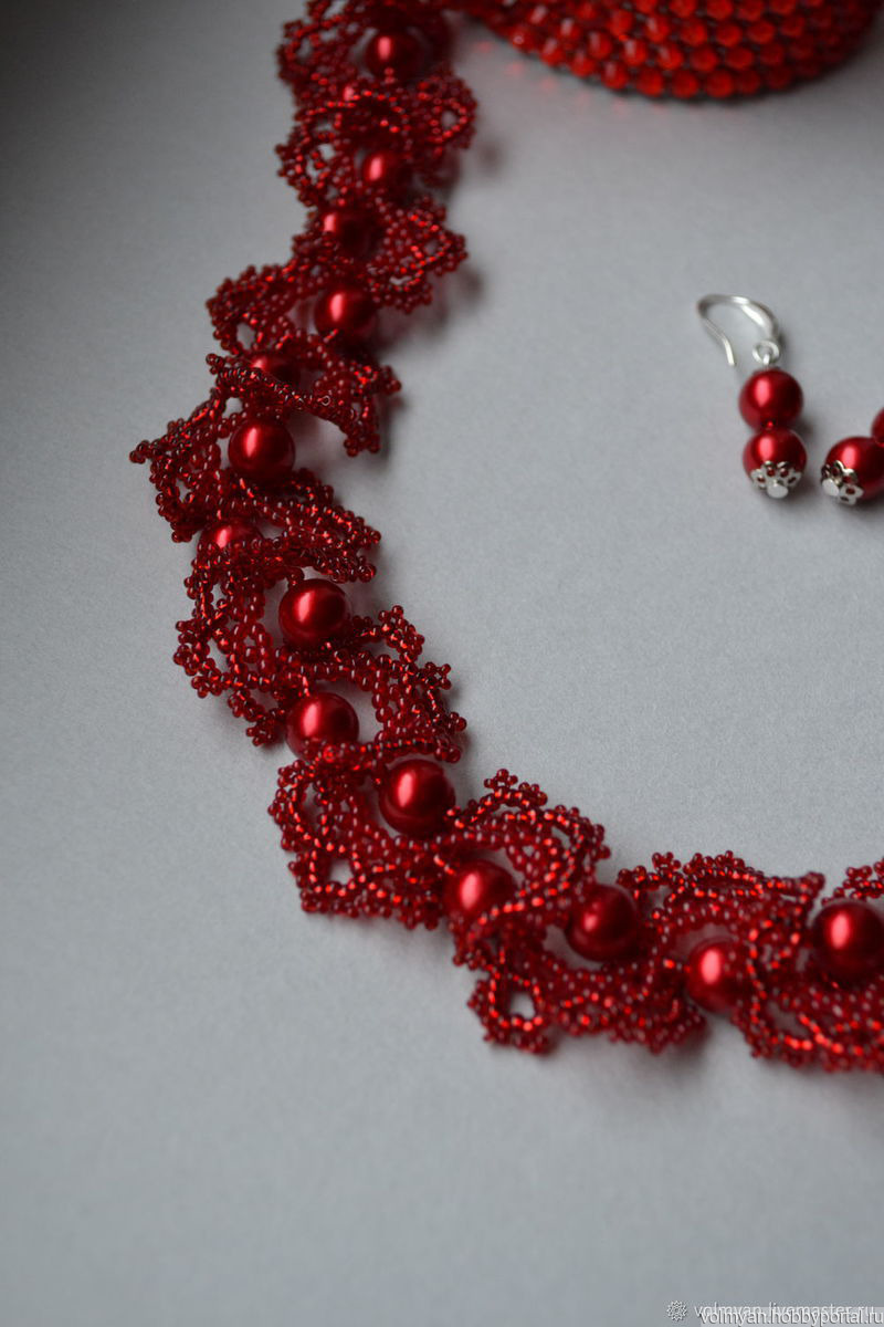 комплект украшений, колье купить, колье, серьги ручной работы, кружевное колье, бисерное колье, колье из бисера, колье вечернее, колье из бисера купить, красное колье, серьги красные, бусы красные, колье купить москва, колье купить спб, ажурное колье из бисера, ожерелье красное