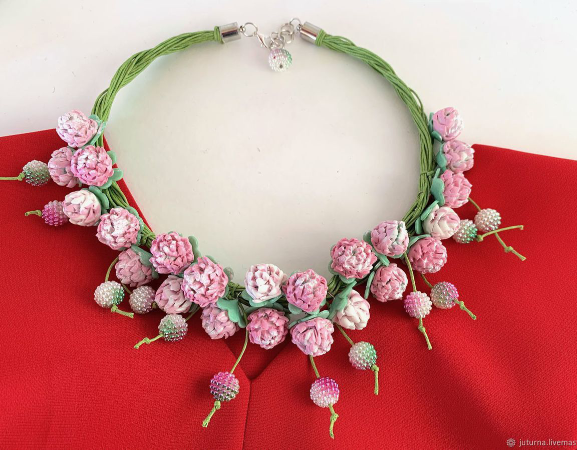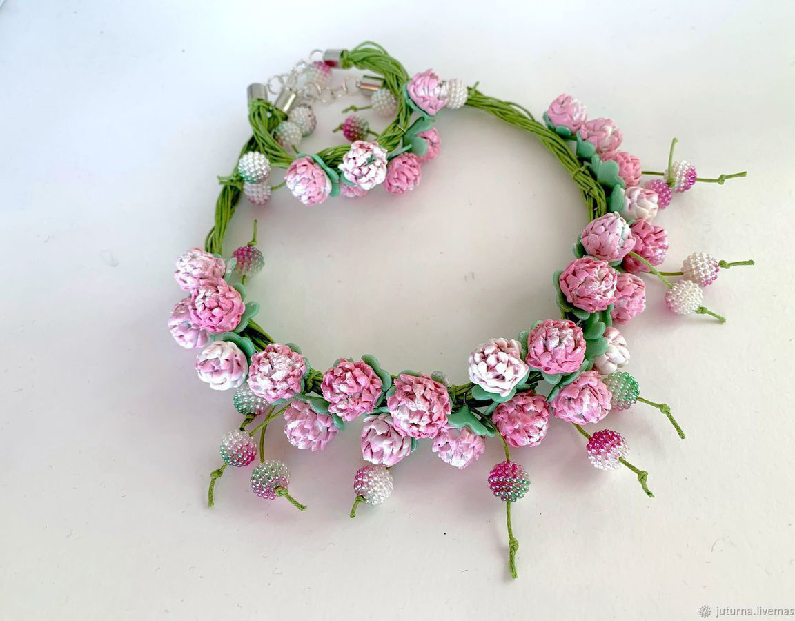 розовый, лето, комплект украшений, клевер, колье и браслет, бижутерия купить, авторская бижутерия, бижутерия из пластики, цветочное украшение, летнее колье, колье на лето, колье на шнурах, цветочное колье, колье из цветов, красивое колье купить, авторское колье купить, цветы клевера, бижутерия из цветов