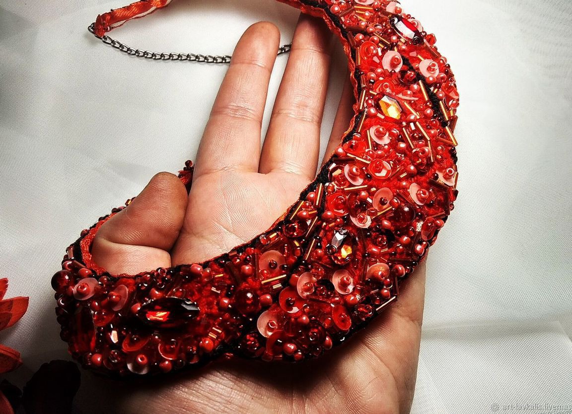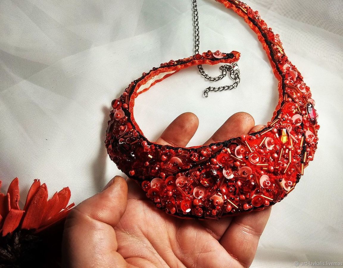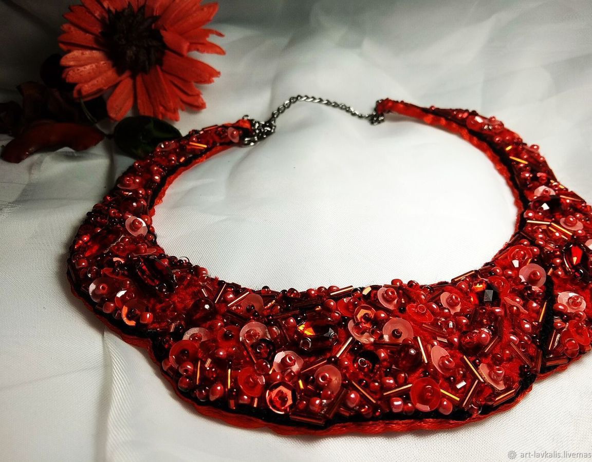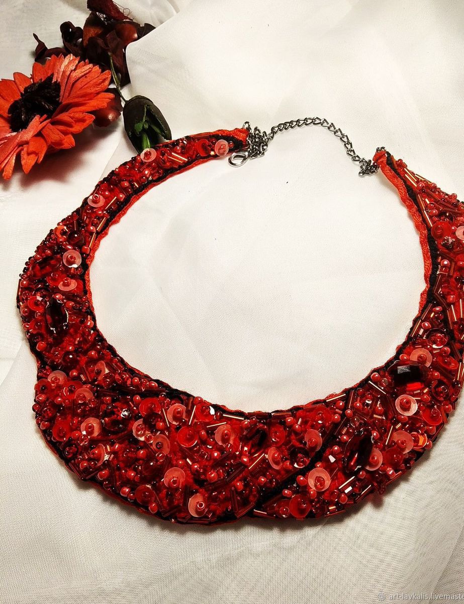 красный, вышивка бисером, подарок, дизайнерские украшения, вечернее украшение, колье-воротник, колье-цветок