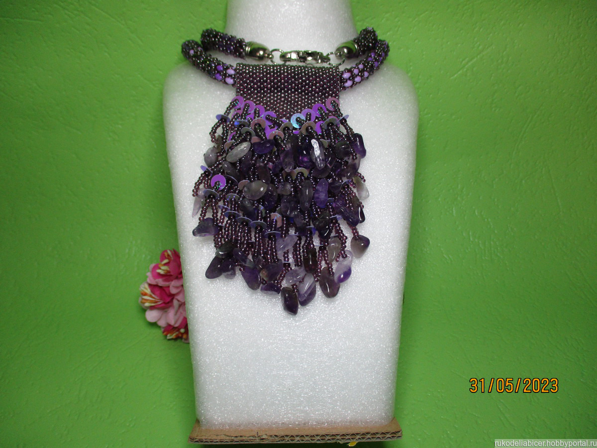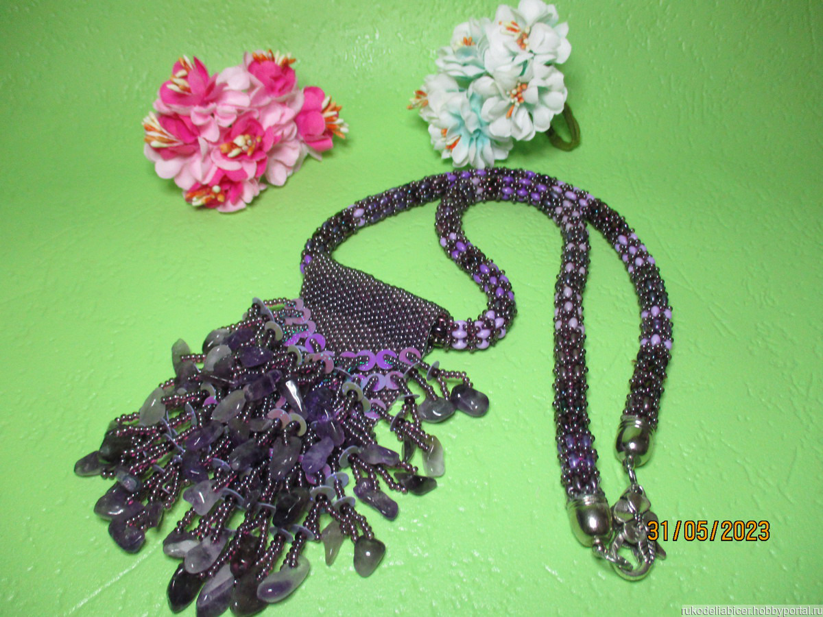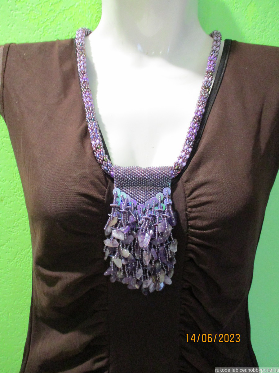 колье сплетено из бисера Тwin, бисера. Кулон сплетен из пайеток, чешского бисера и крошкой аметиста. Фурнитура под цвет серебра. Длина жгута 50 см. Кулон длина 10 см.