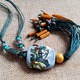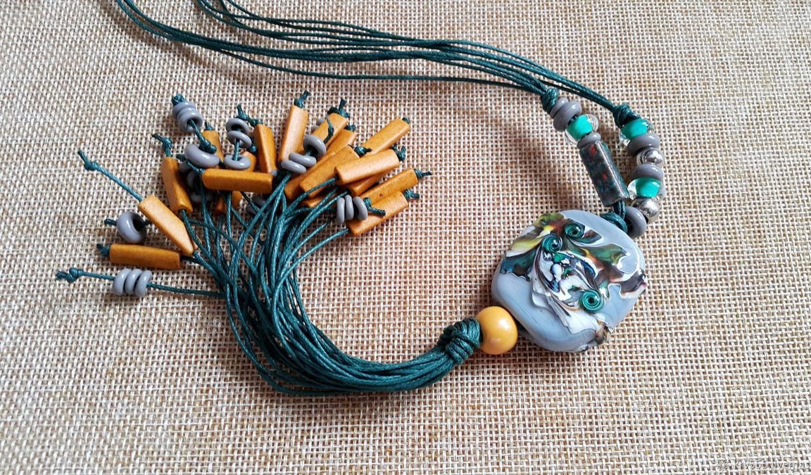 Колье собрано на вощеных шнурах зеленого цвета. Состоит из авторских бусин лэмпворк и греческой керамики. Акцентом у колье является крупная бусина лэмпворк в серо зеленых тонах, диаметр 3,5*3,5 см, толщина 1,3 см. Кисть в колье из вощеных шнуров, на концах которых надеты трубочки из керамики и рондельки лэмпворк. Длина всей подвески 18 см.