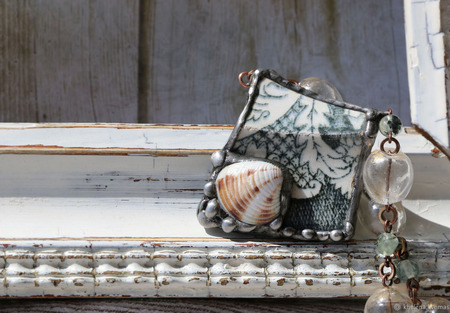 Материалы: винтажный фаянс, фрагменты посуды, винтажное стекло, бусины лэмпворк, пренит, ракушка, медь, припой, металлофурнитура.