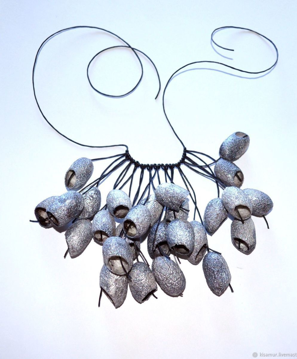 Колье сделано из шёлковых коконов, окрашенных серебряный цвет + хлопковый шнурок