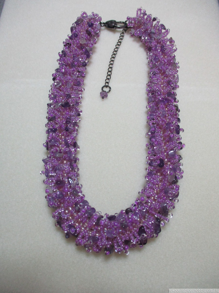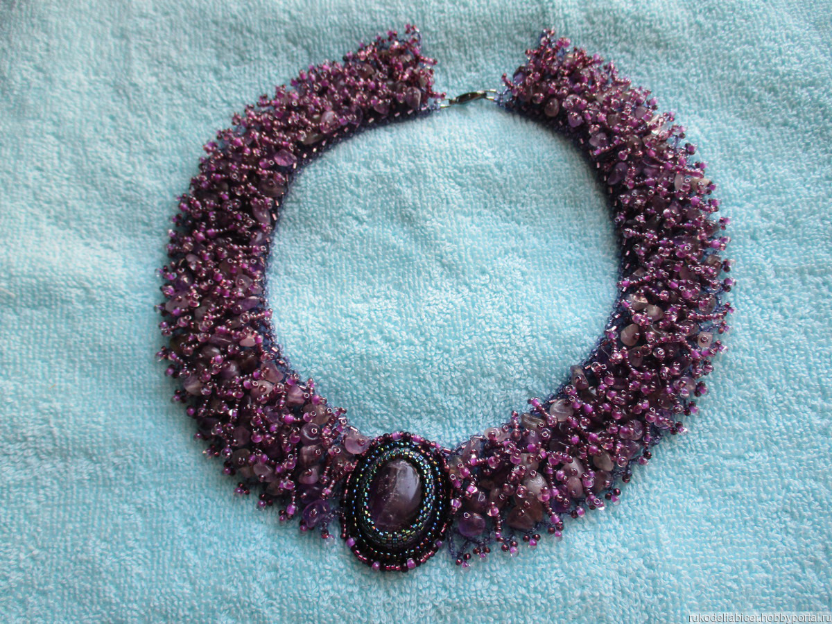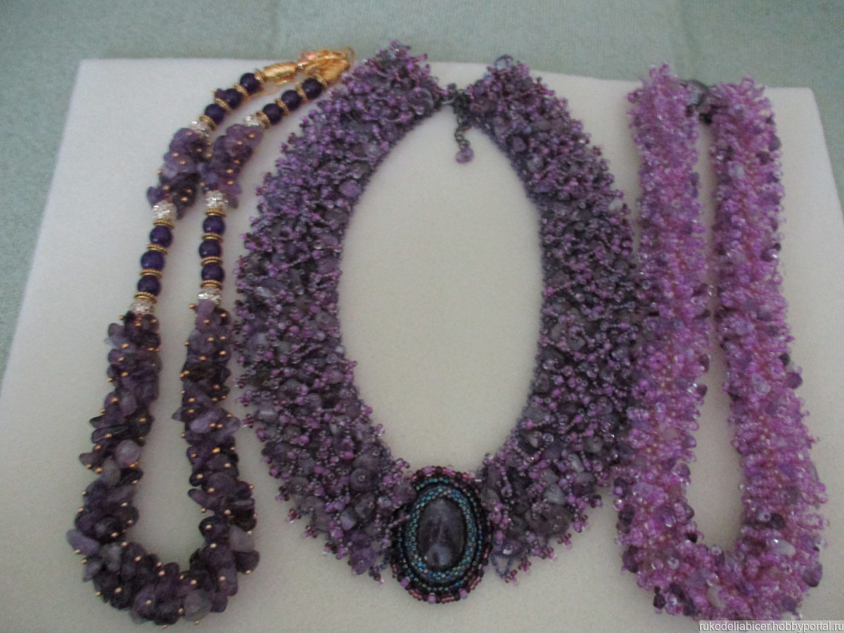 Аметист = камень духовности, преданности, не порочности и чистоты. Символизирует искренность, миролюбие и душевный покой! Колье сплетено бисерной сеткой, Кабашон аметист оплетен японским бисером и приплетён к бисерной сетке. расшитой каменной крошкой аметиста, бисером дропс, Длина колье 37 см колье цена 3000 руб."Пушистик" длина 38+7 см. цена 3000 руб. колье "Льдинка" длина 45+5 см цена 2800 руб.. Аметист противопоказан ТЕЛЬЦАМ И ЛЬВАМ. ЦЕНА УКАЗАНА ЗА ОДНО УКРАШЕНИЕ!