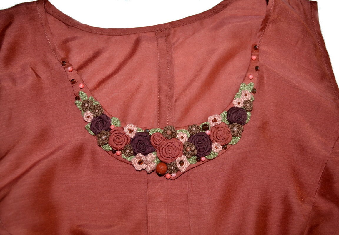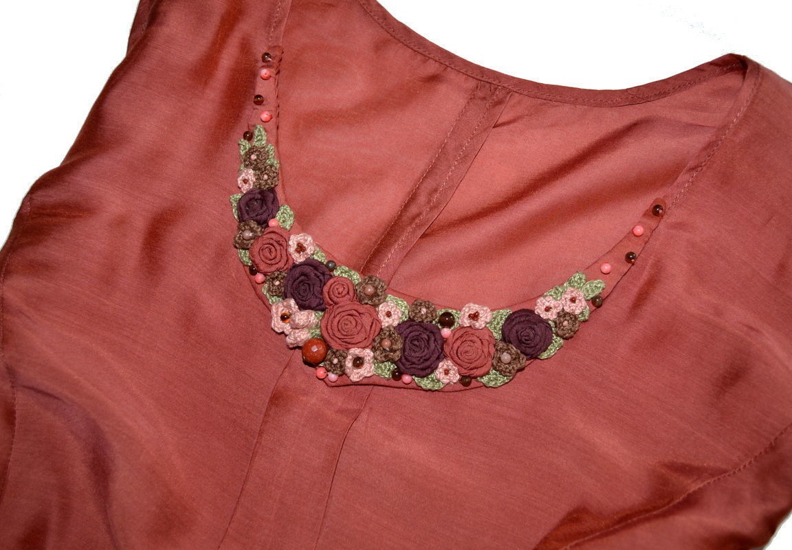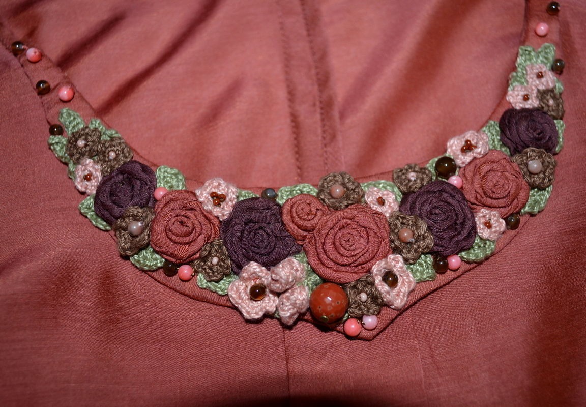 Очень женственное цветочное колье в коричнево - терракотовых тонах подчеркнет Вашу индивидуальность и изысканный вкус. Этот аксессуар отлично украсит блузку, льняную хлопковую одежду, а также к платье с глубоким декольте. Длину колье могу сделать любую.