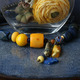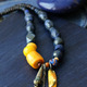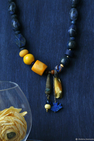 Украшение, построенное на контрасте приглушенного синего и насыщенного желтого цветов. Основой колье послужили содалит, лазурит и его имитация. Ярким акцентом идут сочные желтые коралл, керамика и пара бусин из африканского стекла. Центр колье декорирован подвесками. Первая - посеребренная латунь с естественной патиной, куплена на блошином рынке в Афинах. Вторая – лазуритовая птичка на винтажной цепочке. Третья – из «плавленного янтаря» советских времен. Завершают края колье костяные бусины, привезенные из Иордании. Небольшая удлиняющая цепочка собрана из оксидированного нейзильбера.