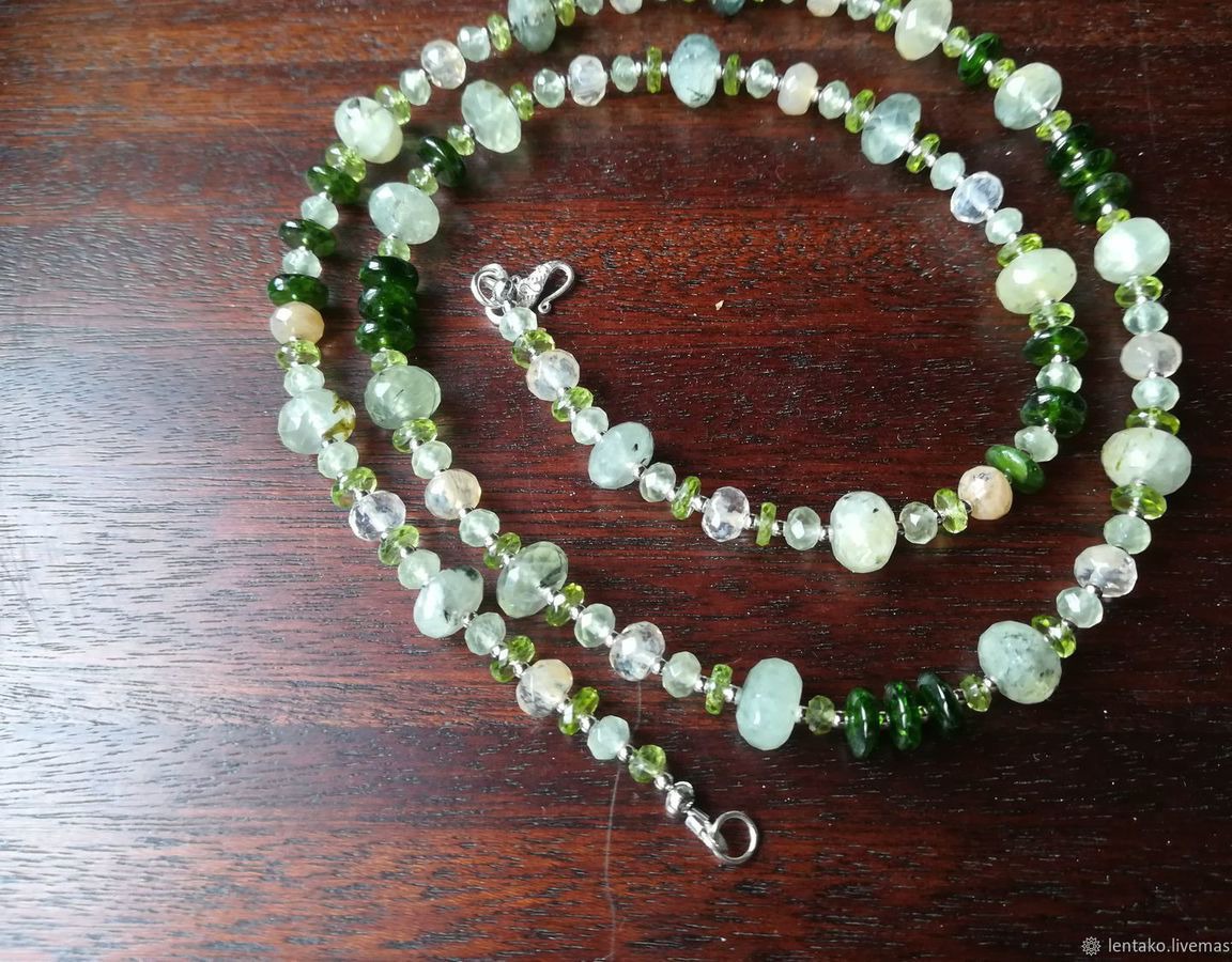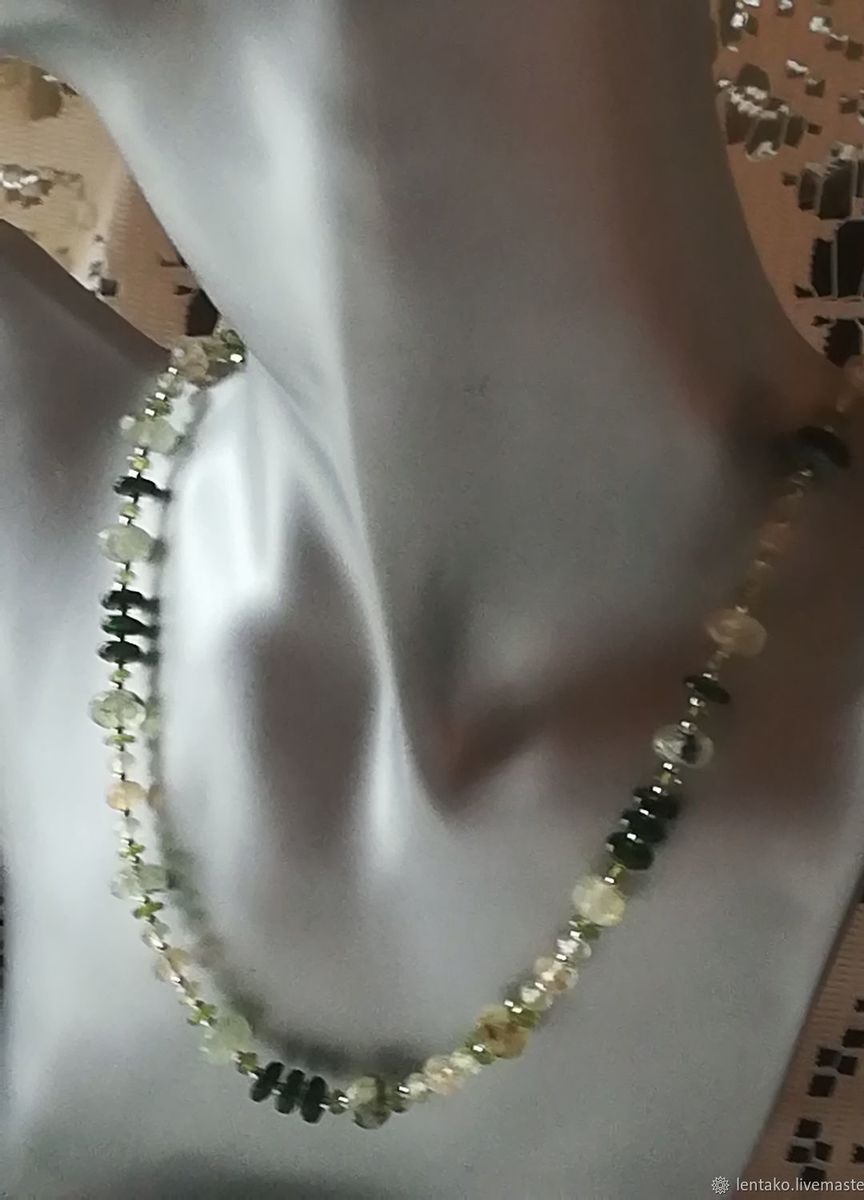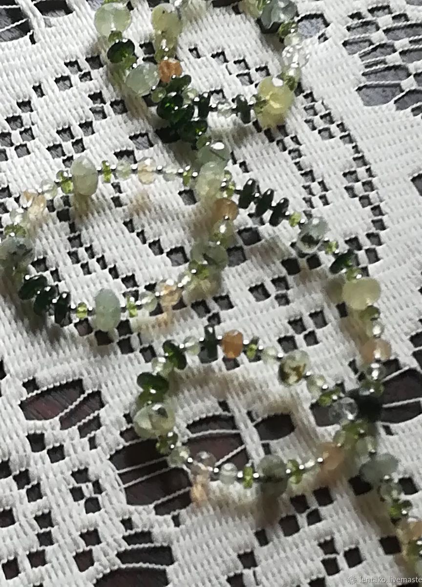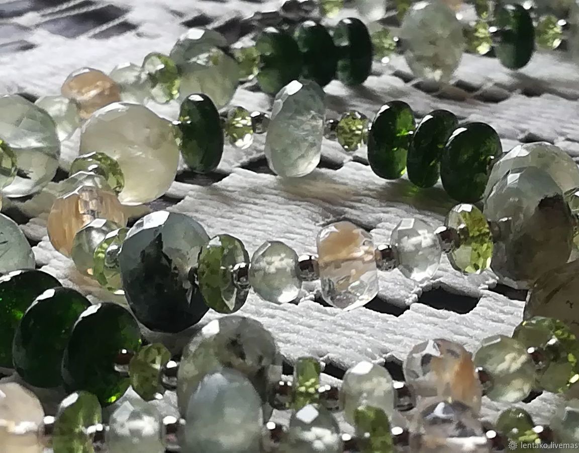 Очень нежное колье из ограненных пренита, хромдиопсида, хризолита и кварца с включениями.