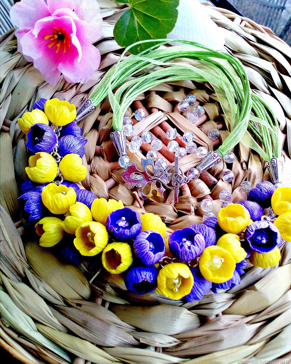 Очень красивое колье Весенний букет сделано из полимерной глины, в центре каждого полого бутона бусины, дополняет жёлто-сиреневый букет зелень вощёного с органзой шнура и застежка-тогл в виде листика. Колье объемное, но очень легкое. Это украшение - прекрасный подарок для себя любимой, не оставит Вас не замеченной.