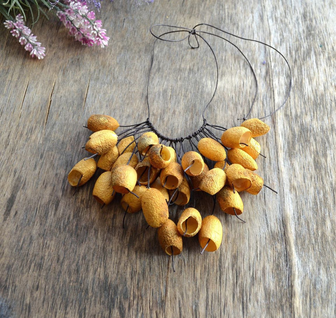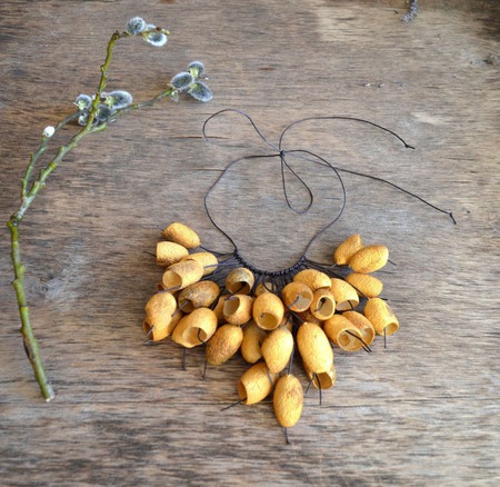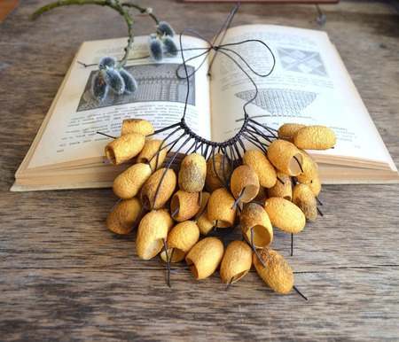 Колье сделано из шёлковых коконов, окрашенных золотисто охристо коричневый цвет+ хлопковый шнурок