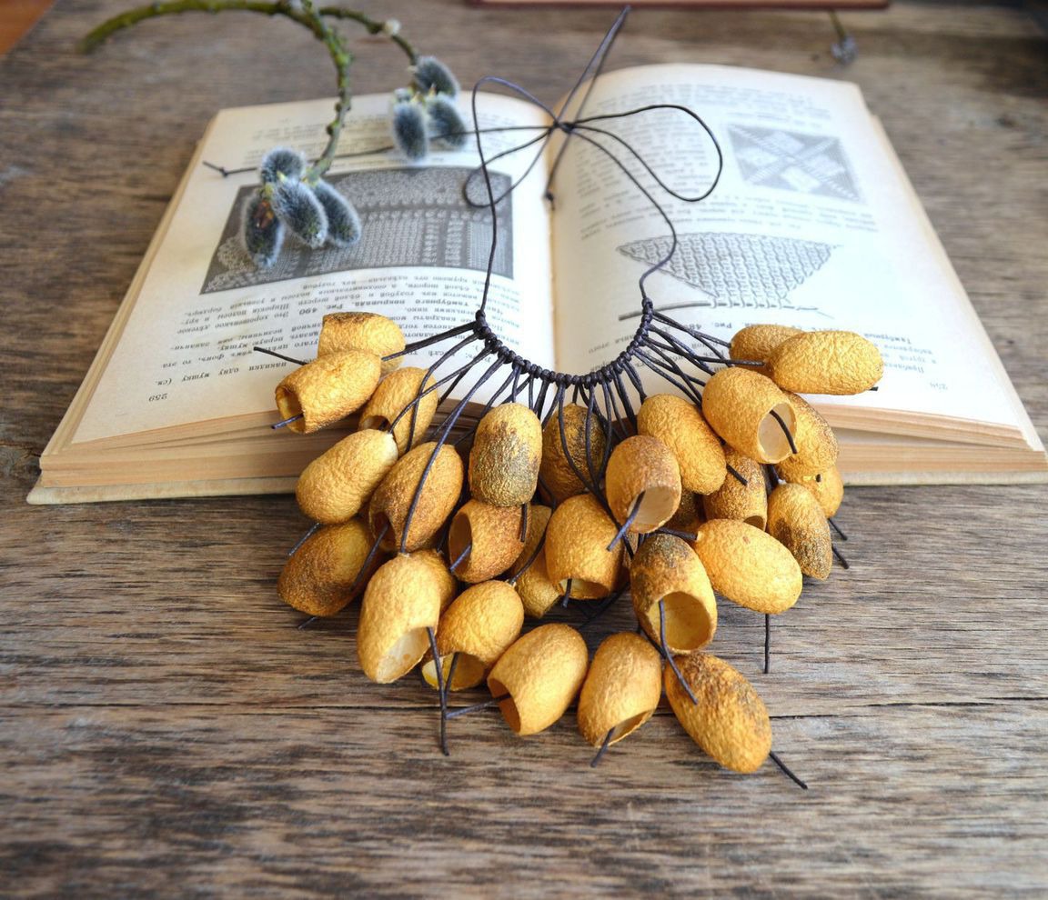 колокольчик, золотой, колье ручной работы, летнее украшение, золотой цвет, БОХО украшение, бохо колье, золотистый цвет, романтичное украшение, летнее колье, необычное колье, легкое колье, романтичное колье, шелковое украшение, колье из коконов, тутовый шелкопряд, золотистое колье, золотистые бусины, колье золотого цвета