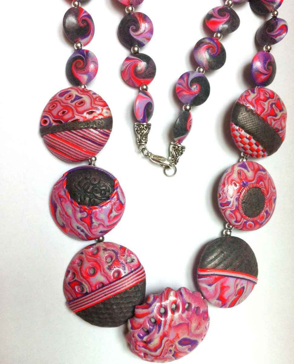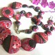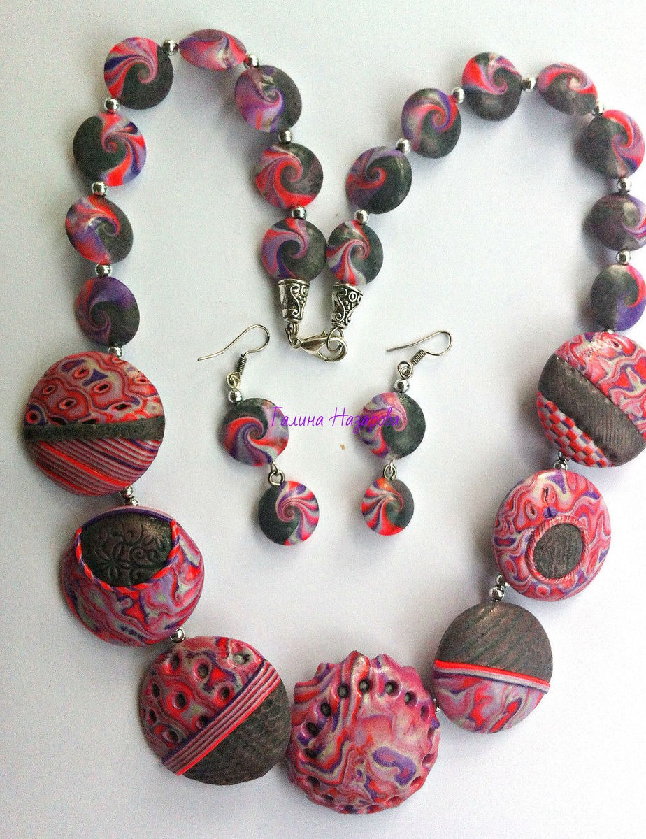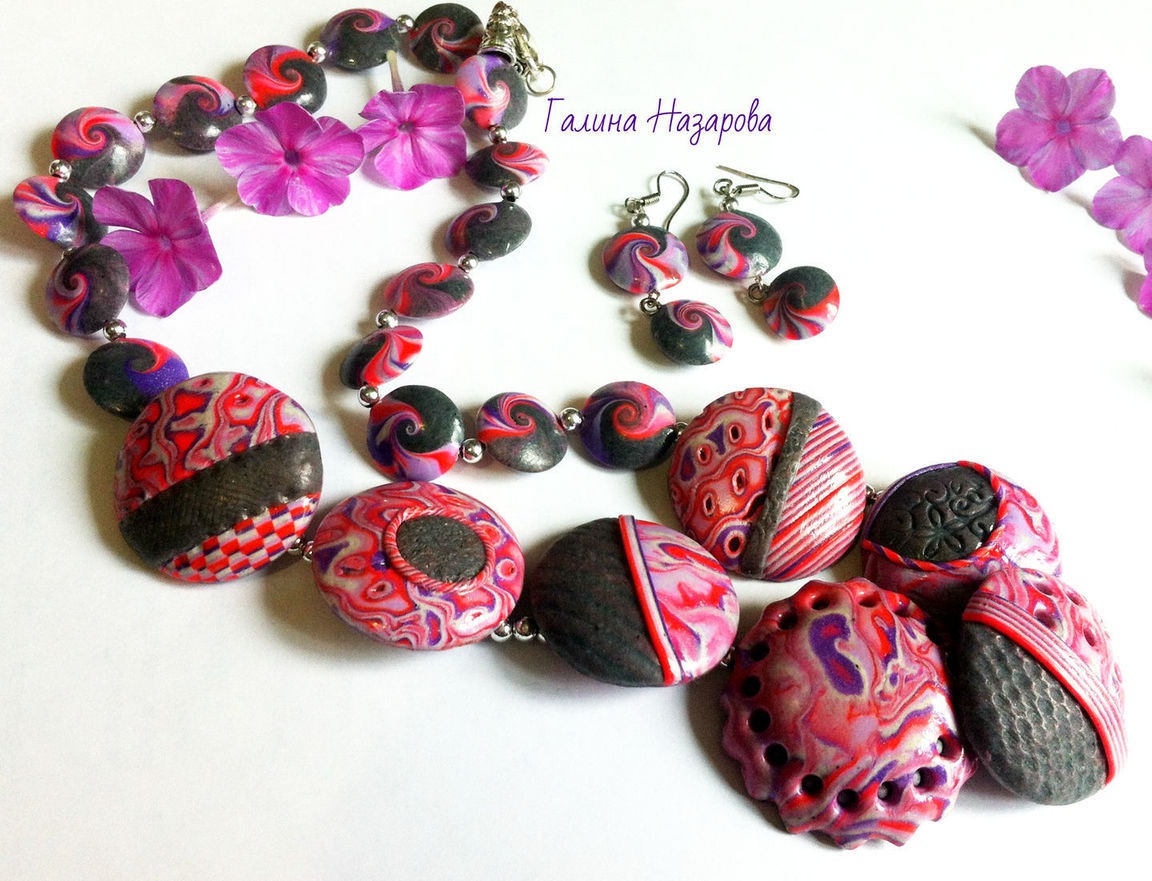 Комплект украшений - это бусы(колье) и серьги выполнен из полимерной глины, покрыт глянцевым лаком. Использованы техники - макуме гане, текстура, бусины-чечевички.