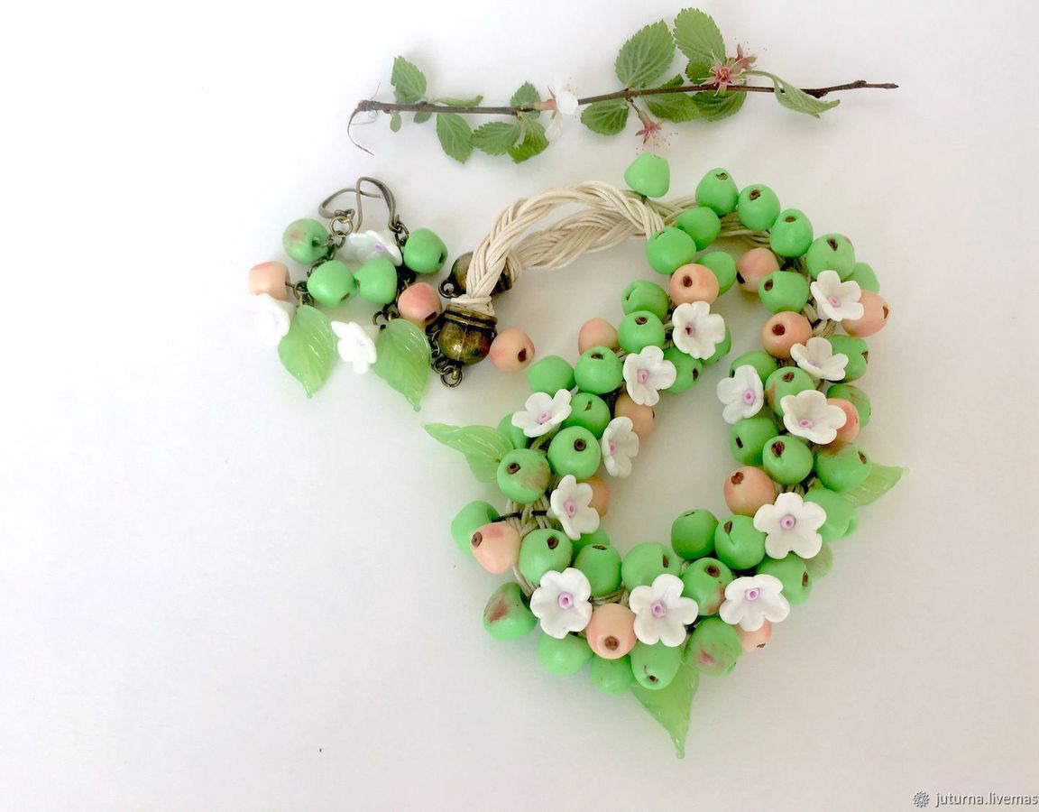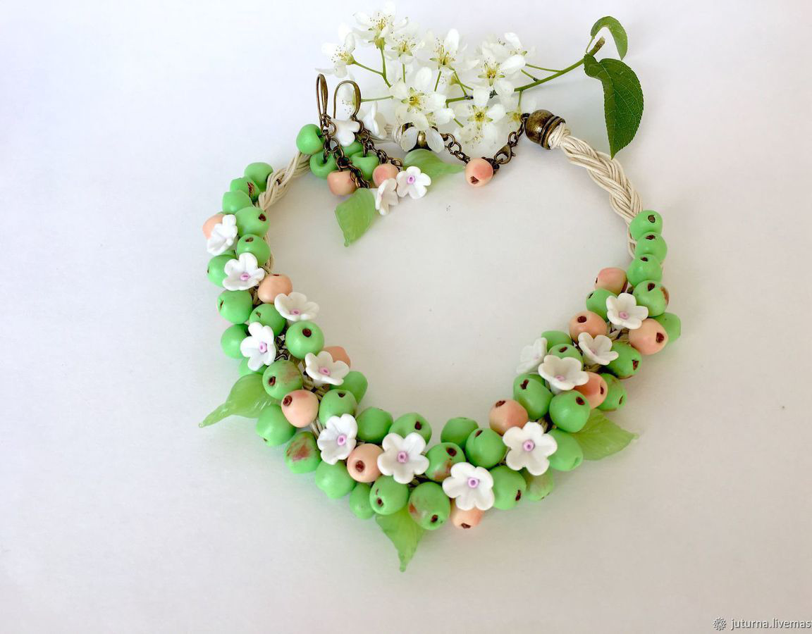 Колье собрано на вощеные шнуры молочного цвета. Комплект украшений из яблок и цветочков сделанных из запекаемой полимерной глины, тонированных и покрытых лаком. С добавлением резных листиков из стекла.