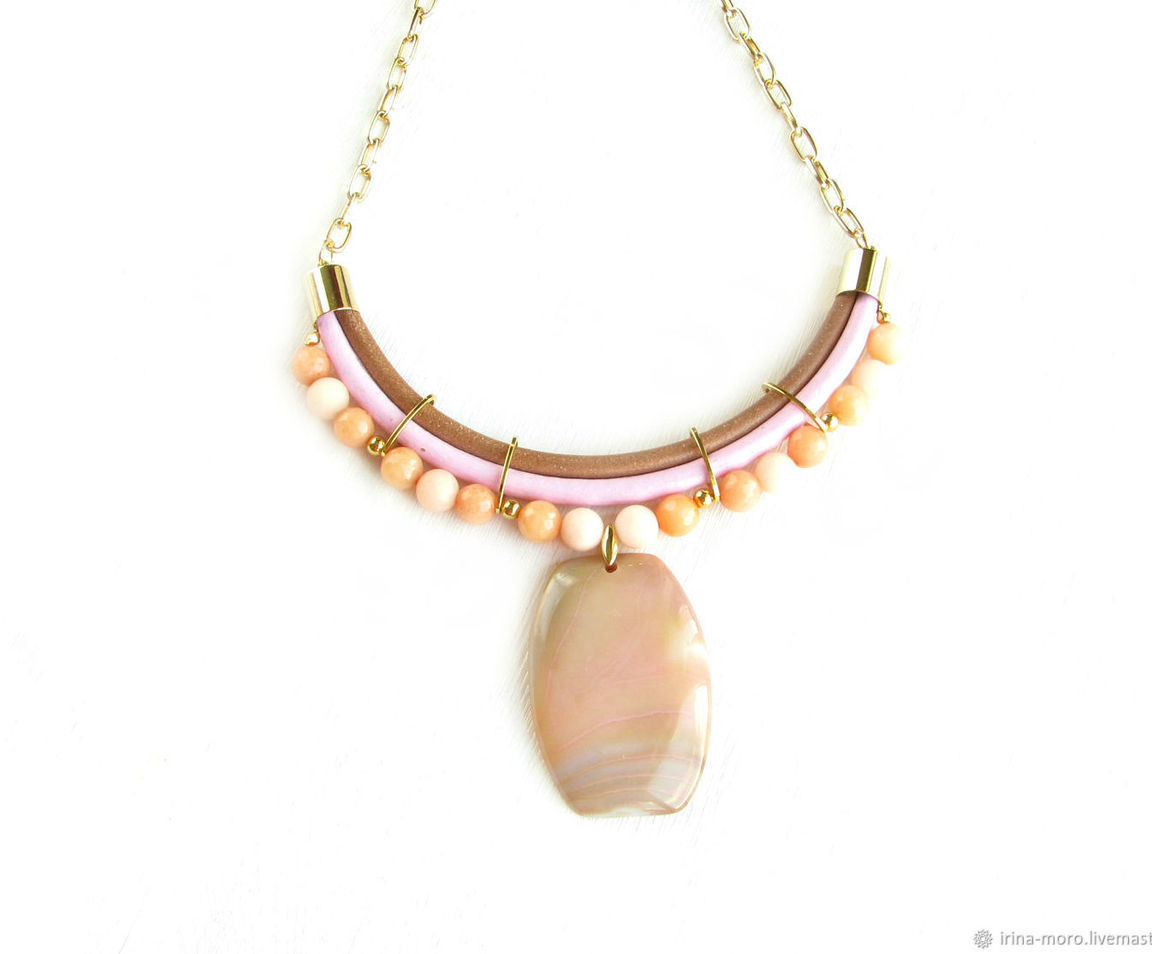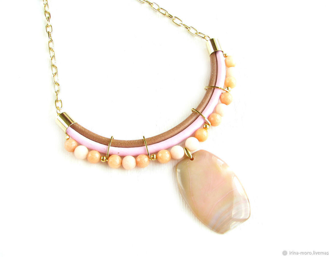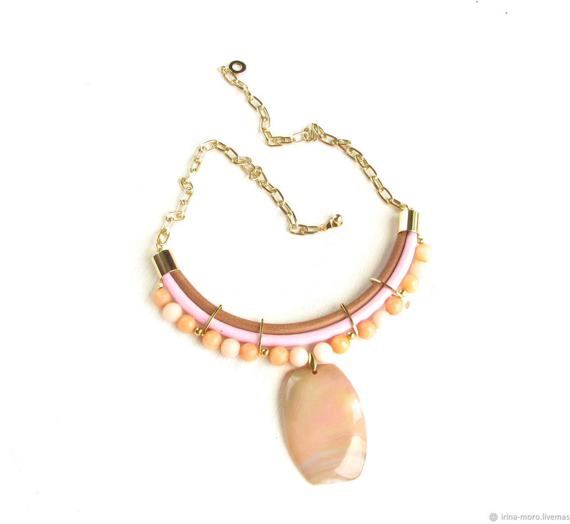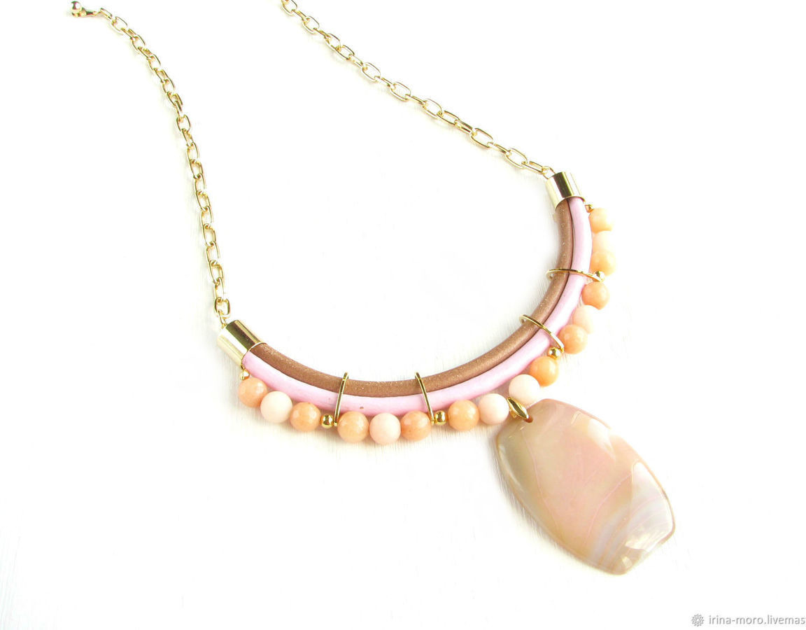 колье из кожи, кожаное колье, колье с подвеской, крупное колье, нежное колье, модное колье, бежевое колье, розовое колье, легкое колье, колье на цепочке, золотое колье, колье с агатами, светлое колье, колье с натуральными камнями, колье подарок, колье из агатов, дорогое колье, весна колье, колье бежевое легкое, весна светлое колье