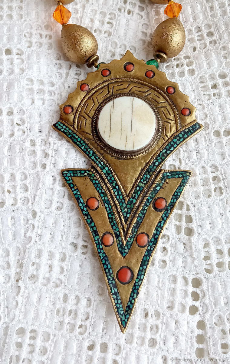 Нетипичная литая непальская латунная подвеска, центральная белая вставка - раковина моллюска, инкрустация из коралла и непальской бирюзы.