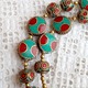 В бусах плоские и круглые непальские латунные бусины с кораллом и бирюзой, и непальские латунные компоненты.