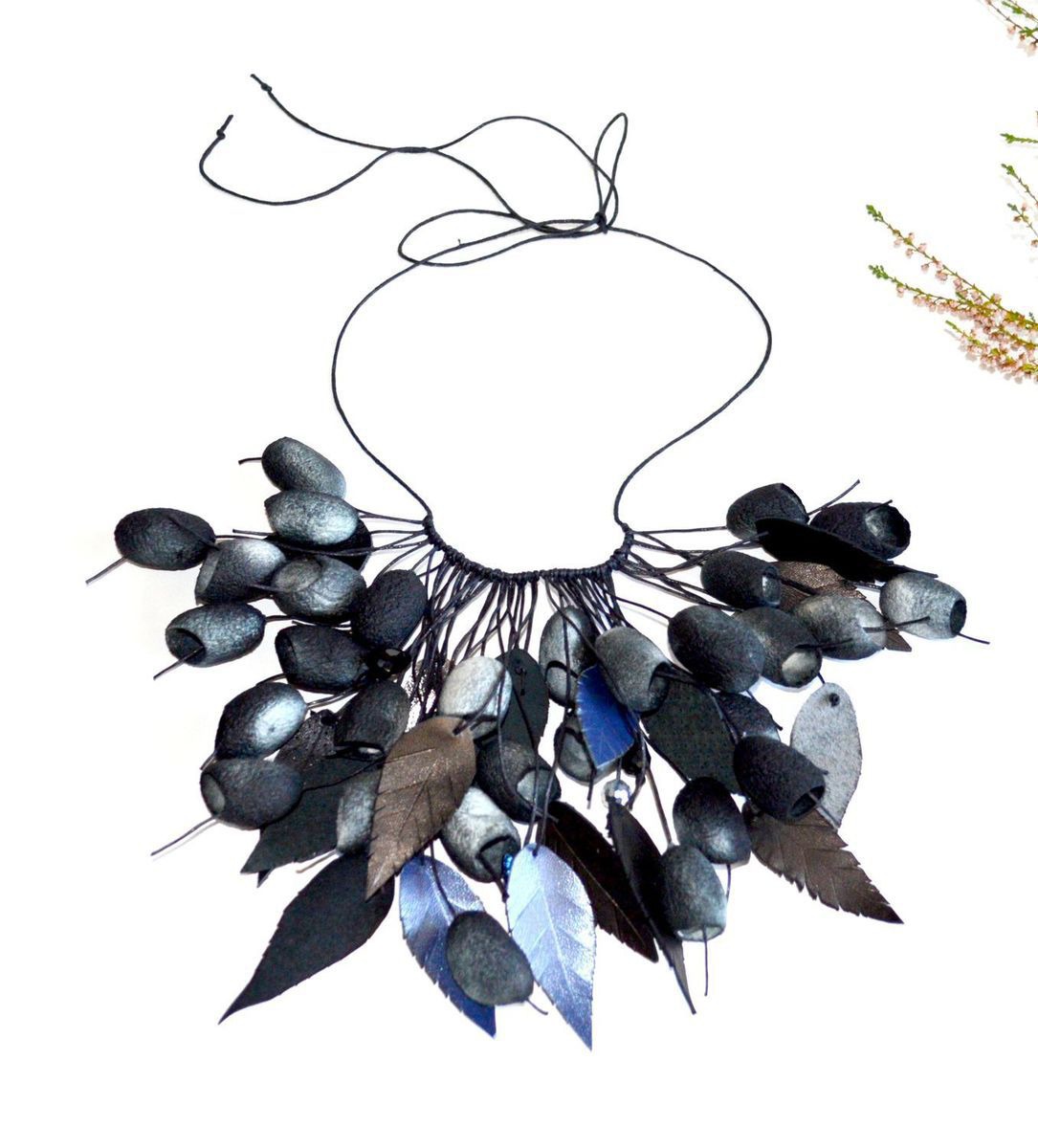 Колье сделано из шёлковых коконов, листьев из натуральной кожи, хлопкового шнурка и стеклянных бусин