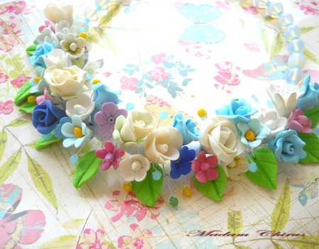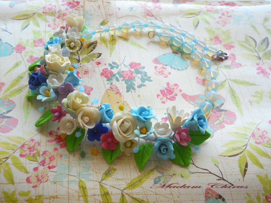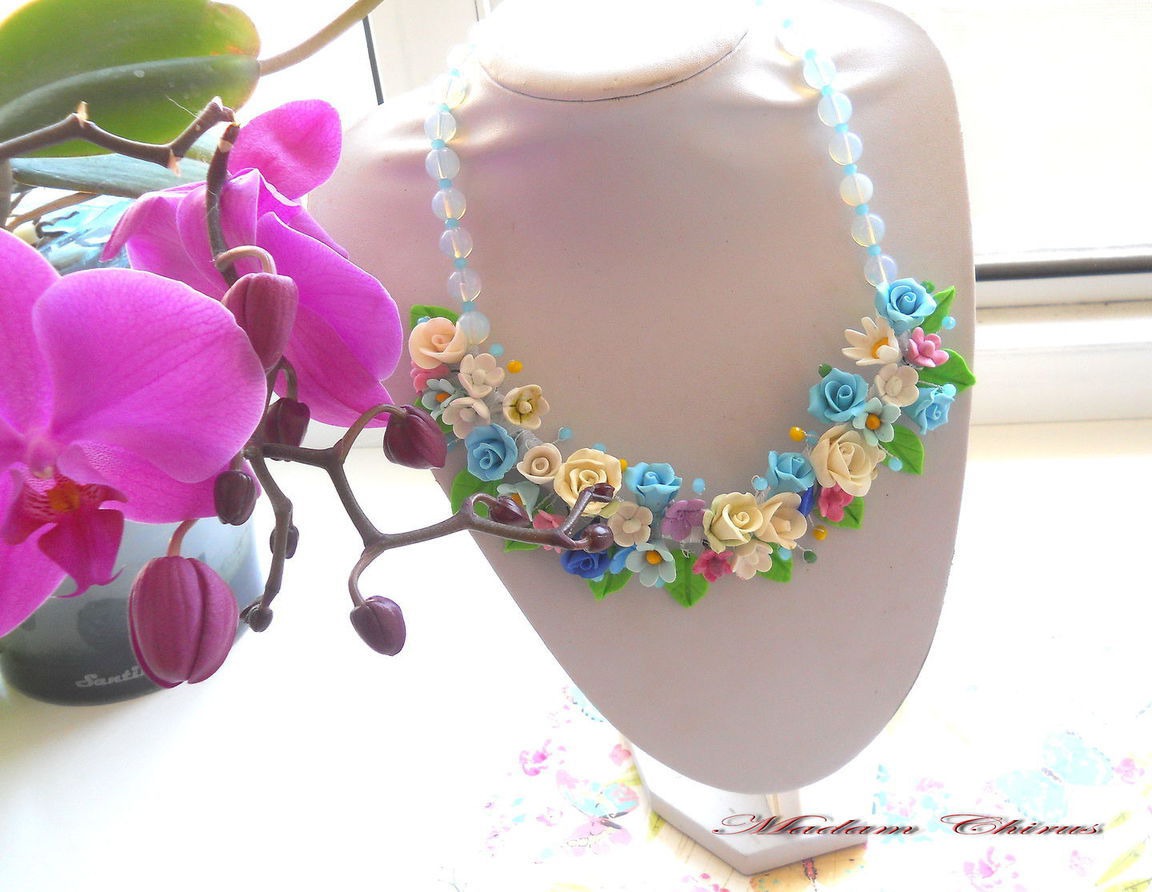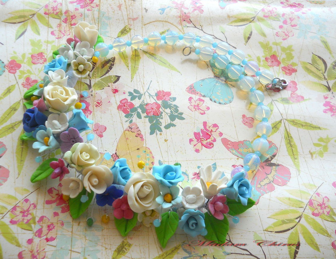 холодный фарфор, комбинированный, колье из полимерной глины, колье для выпускного, колье с цветами, колье летнее, колье из холодного, колье с лунным камнем
