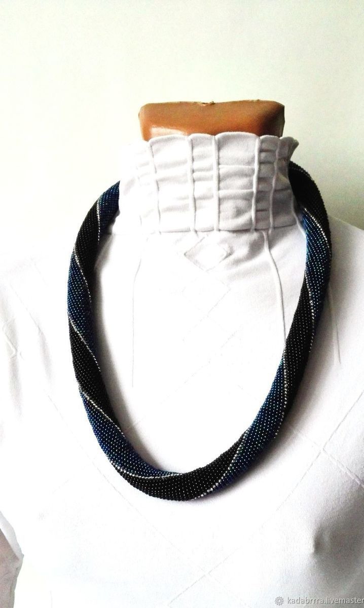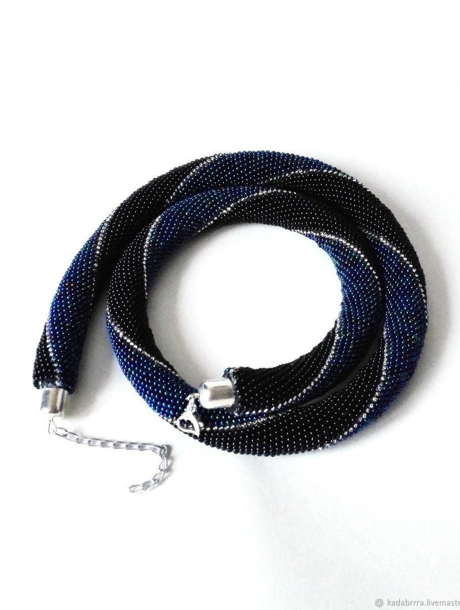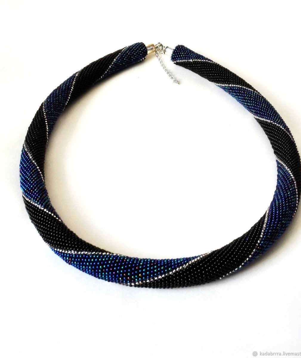 Жгут-колье выполнен из чешского бисера черного, бензинового синего и серебристого цветов. Очень необычное, стильное украшение. Застегивается на удобный замочек-карабин, дополнен удлиняющей цепочкой.