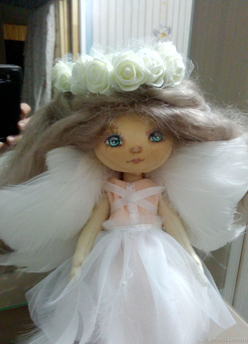 Ангелок сделан в единственном экземпляре, одежда снимается, ручки, ножки, голова двигаются. Волосы из козочки.Будет надежными ангелом-хранителем для своей хозяйки!