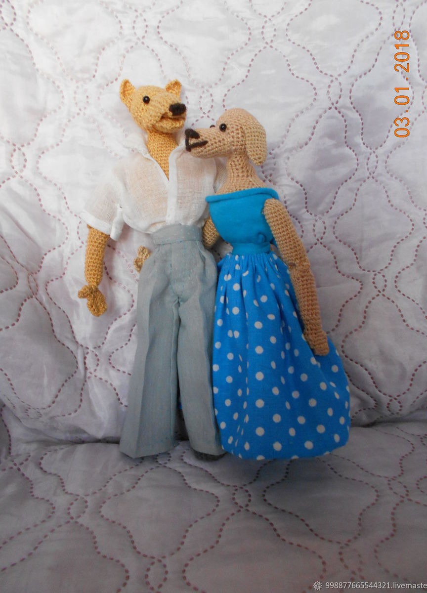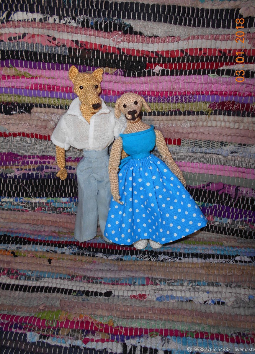 Вязаные крючком Знаки Зодиака. Собаки. Куклы - символы. Это молодая влюбленная пара.Успешный богатый граф Трезоров и его невеста Беата. Куклы стилизованы под молодых людей пятидесятых годов прошлого века. Игрушки - талисманы. Игрушки несут энергетику супружества.